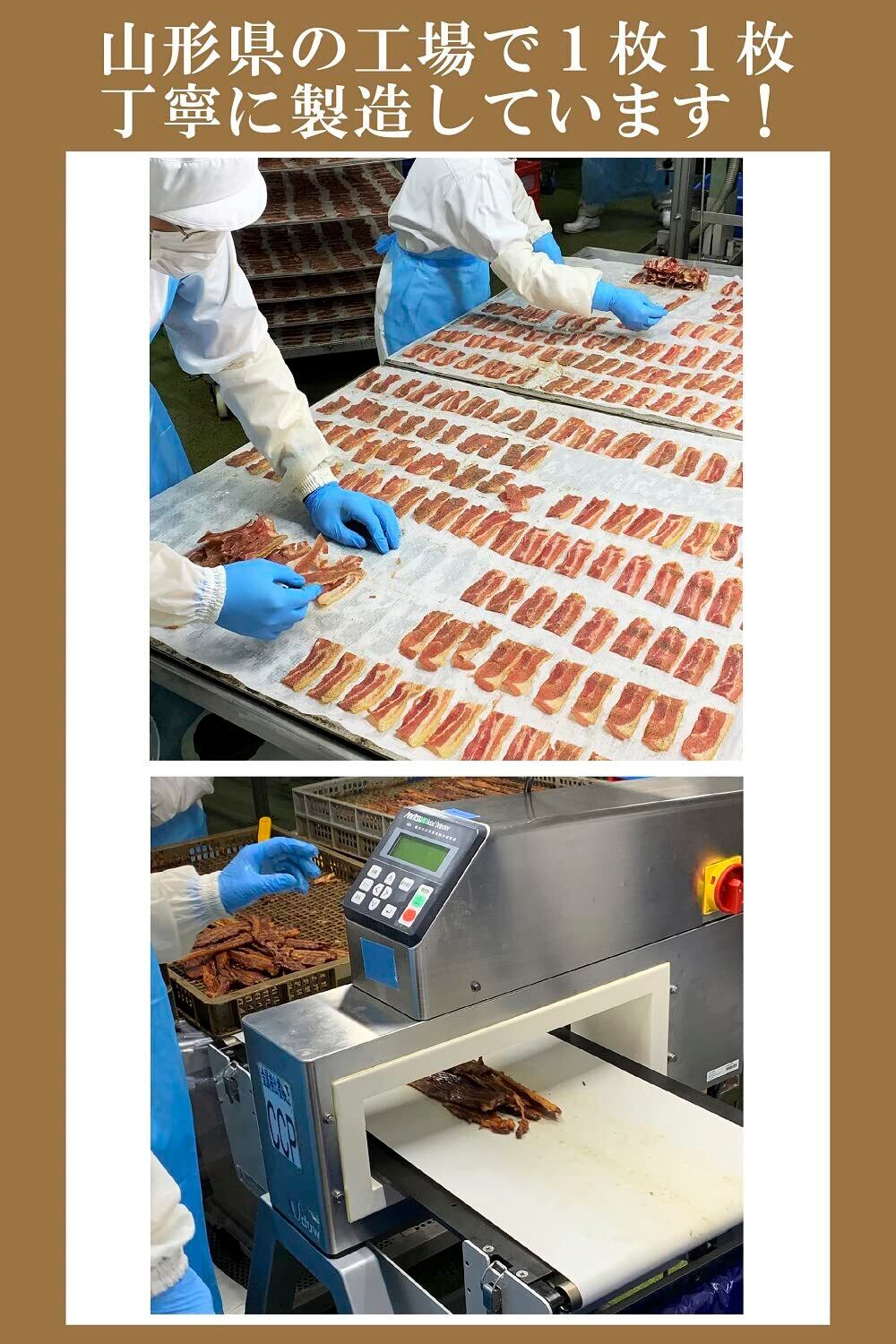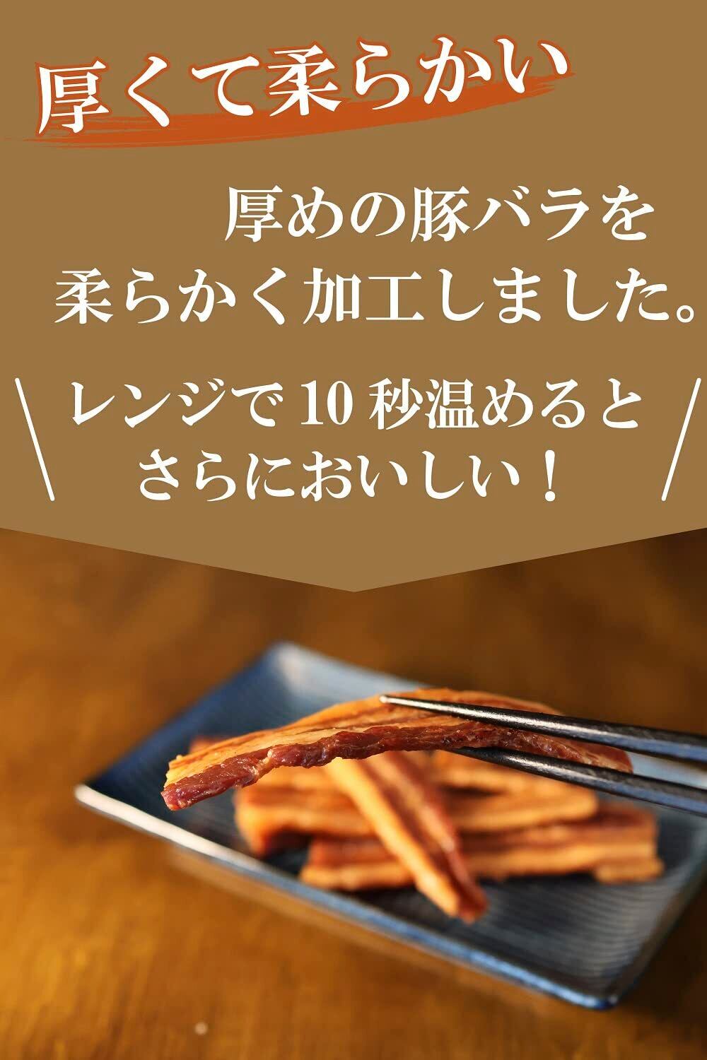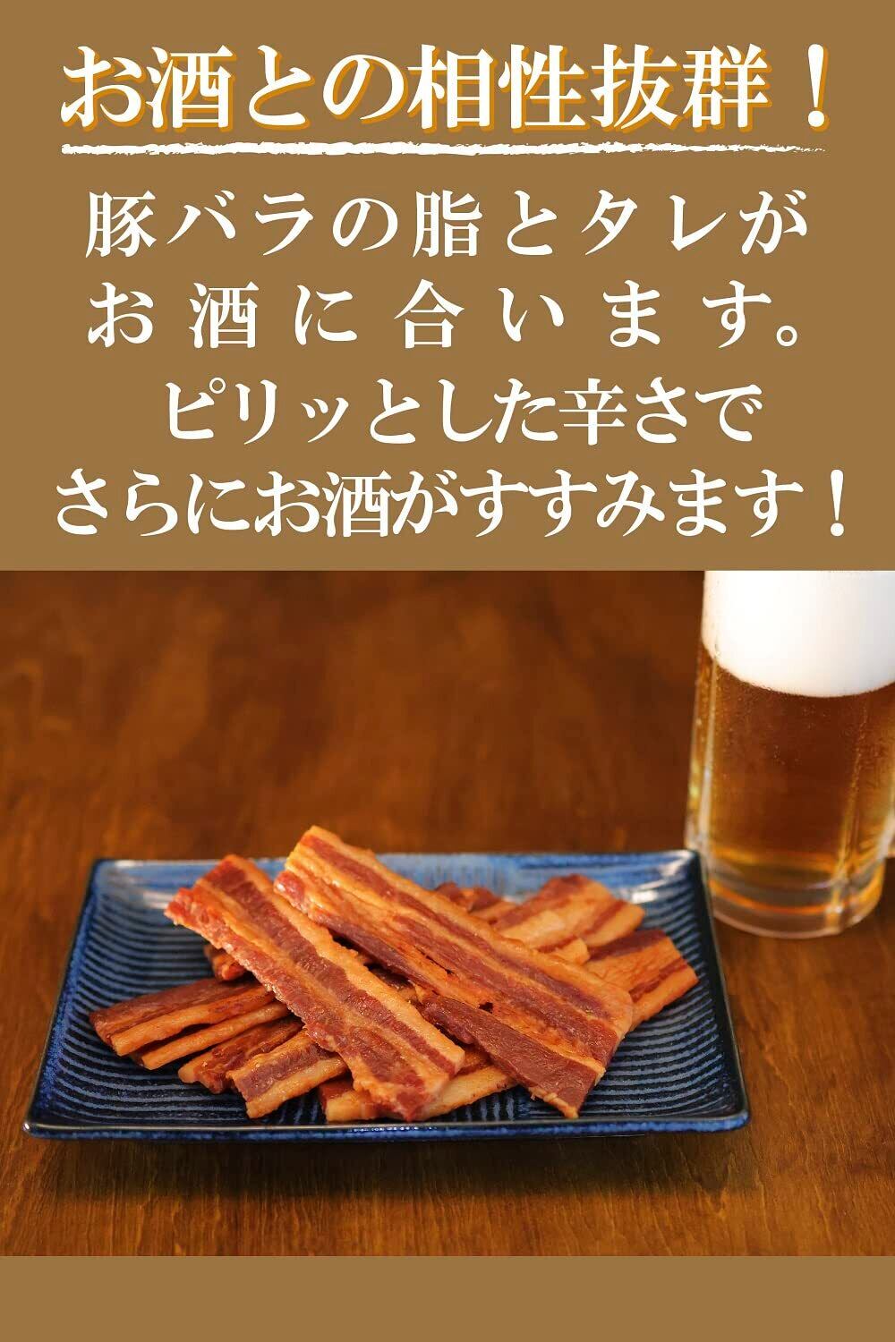 [豚バラとタレが合う!] 豚バラをタレにつけ、しっとり感を残して乾燥させました。唐辛子入りでピリッと辛く、お酒がすすむ一品です。