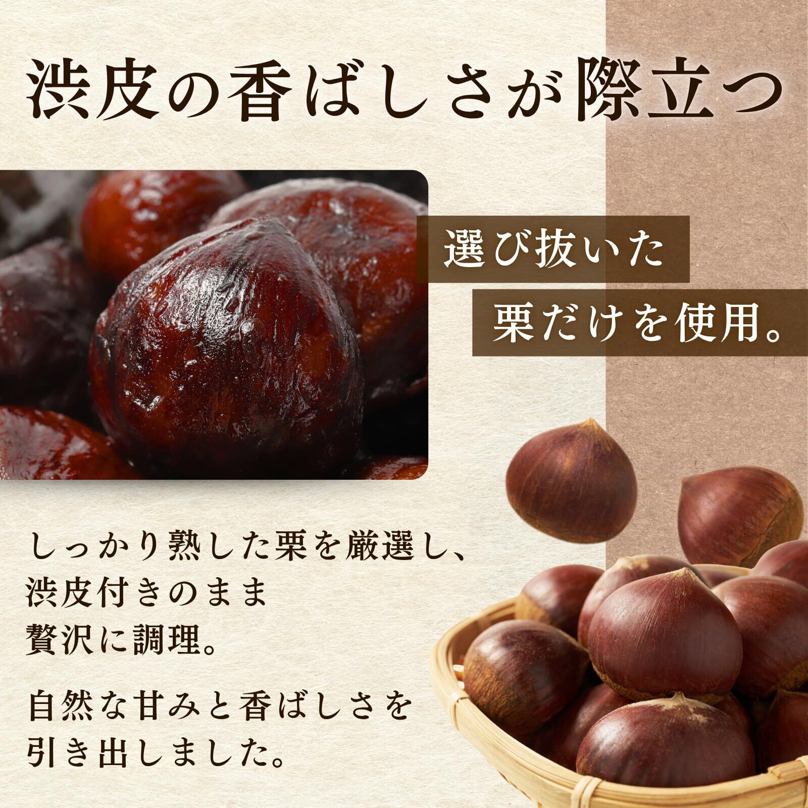 【昔ながらの製法で丁寧に炊き上げ】 渋皮付きのままじっくりと煮込み、丁寧なアク抜きでやさしい甘さに仕上げました。