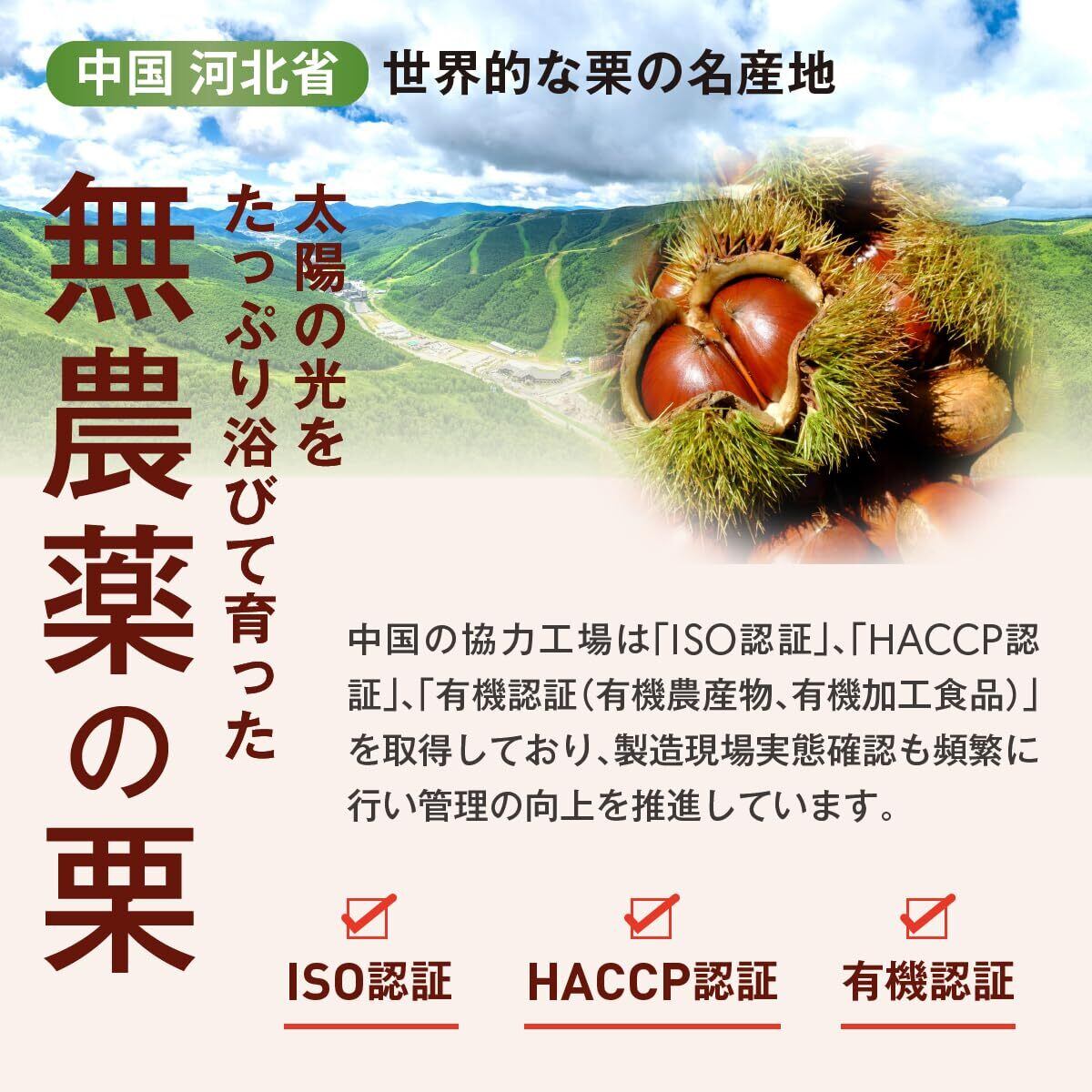 【無農薬・無添加】中国河北省から厳選された農薬不使用の有機栽培栗を仕入れ、残留農薬検査をクリアした安全な原料のみを使用しています。防腐剤や添加物は一切使用していないオーガニックのむき甘栗です。