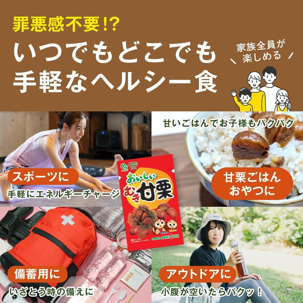 【低〜中GIな甘栗】甘栗は、食後の血糖値の上昇が緩やかな「低〜中GI食品」です。白米やパンと比べて、ダイエット中の空腹感やストレスを軽減し、脂肪を溜め込みにくい体づくりをサポートします。 豊富な食物繊維やビタミンも含まれており、美容と健康を内側から支えます。無添加・無着色なので、忙しい毎日のヘルシーなおやつや、家族みんなで楽しめる安心の食品です。おいしいのにヘルシー、それがむき甘栗の新しい価値です。