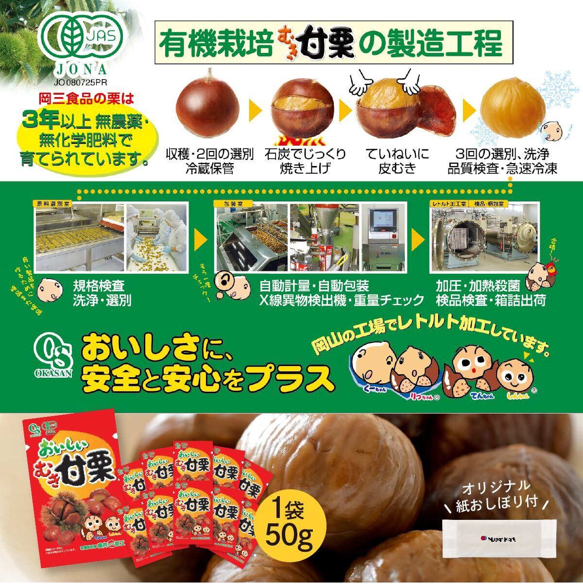 おいしいむき甘栗(平袋) 50g✕10袋 有機栽培栗・無農薬・無添加のむきぐり オーガニック天津甘栗 有機JAS認証 国内加工 個包装 岡三食品