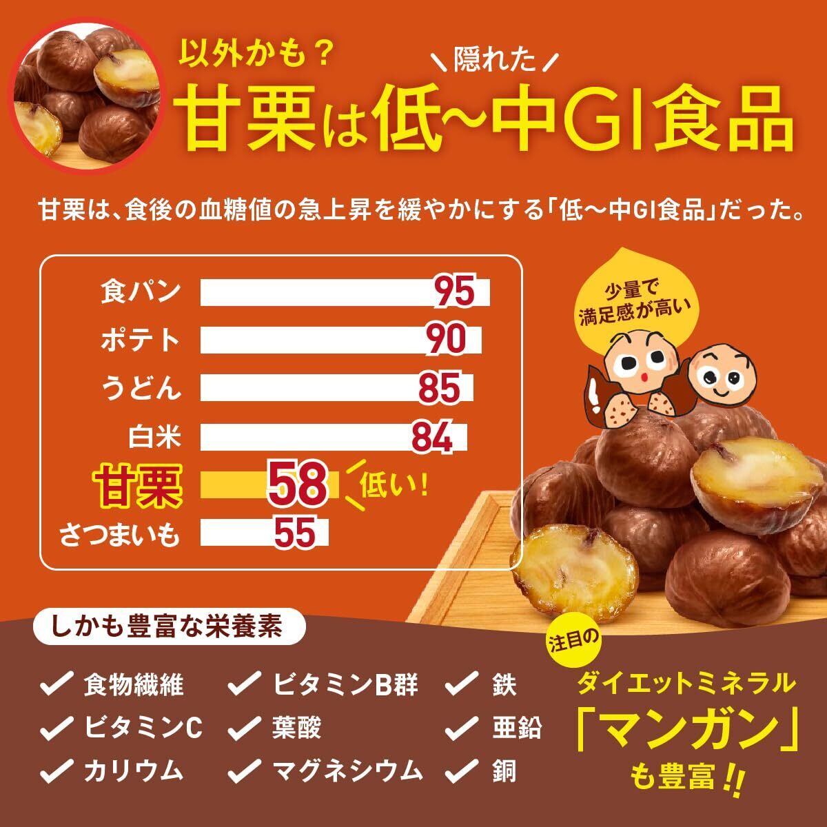 【低〜中GIな甘栗】甘栗は、食後の血糖値の上昇が緩やかな「低〜中GI食品」です。白米やパンと比べて、ダイエット中の空腹感やストレスを軽減し、脂肪を溜め込みにくい体づくりをサポートします。 豊富な食物繊維やビタミンも含まれており、美容と健康を内側から支えます。無添加・無着色なので、忙しい毎日のヘルシーなおやつや、家族みんなで楽しめる安心の食品です。おいしいのにヘルシー、それがむき甘栗の新しい価値です。