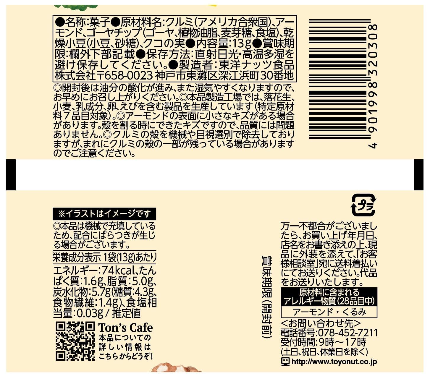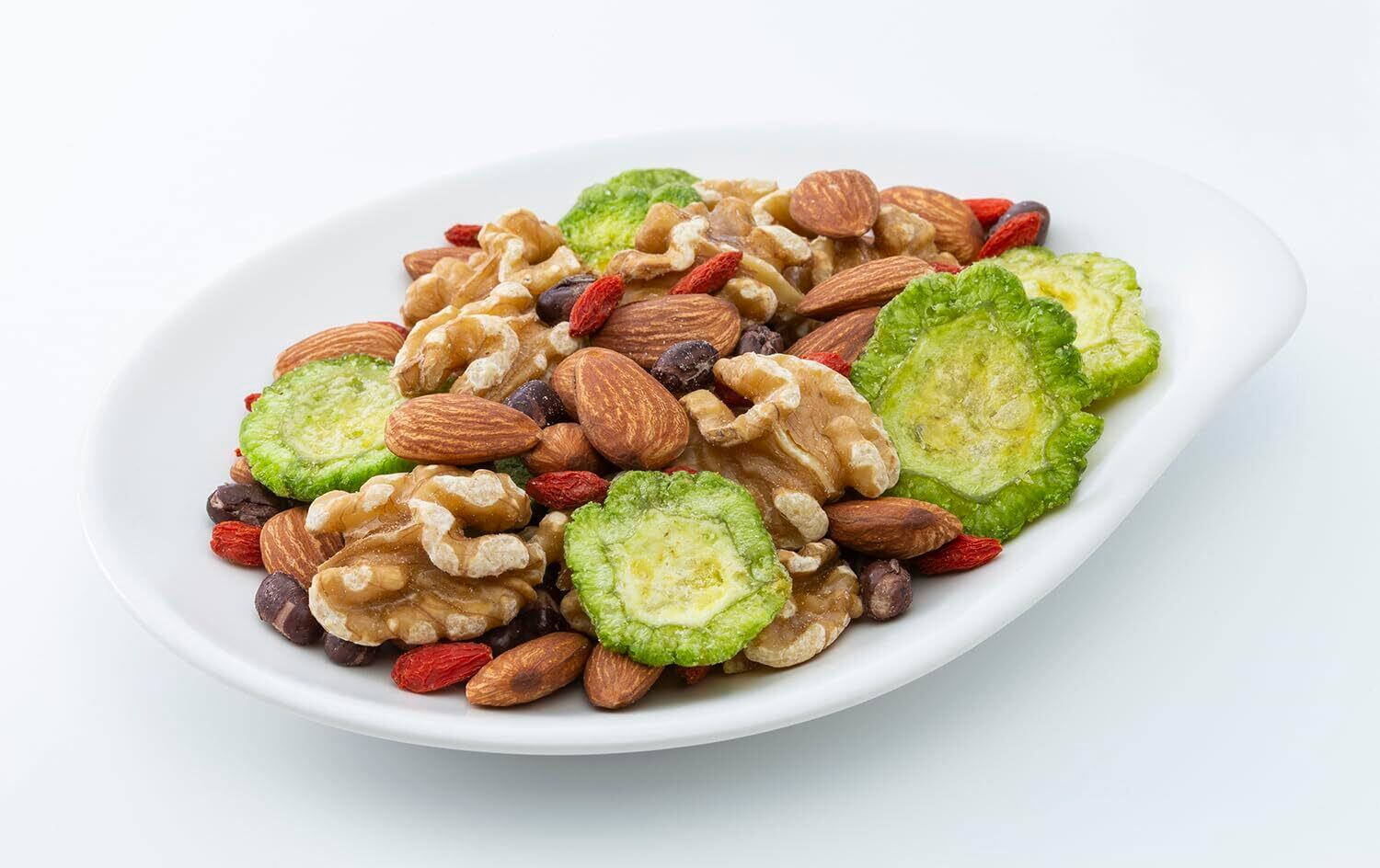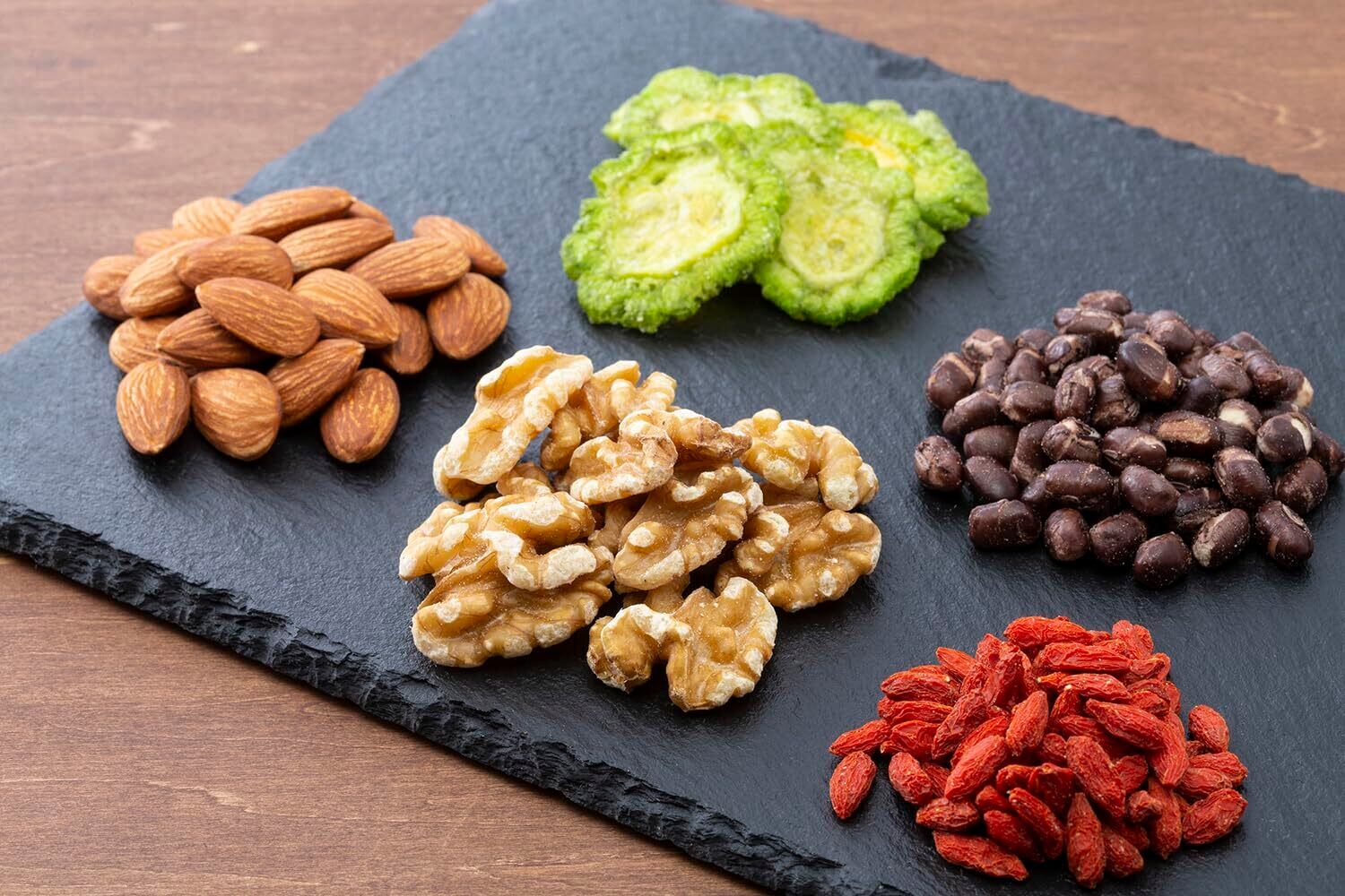 クルミ(アメリカ合衆国)、アーモンド、ゴーヤチップ(ゴーヤ、植物油脂、麦芽糖、食塩)、乾燥小豆(小豆、砂糖)、クコの実