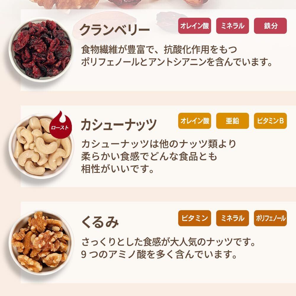 ● 原材料名:アーモンド(アメリカ産)、くるみ、カシューナッツ、乾燥クランベリー(クランベリー、砂糖、植物油脂) (アーモンド、カシューナッツは焙煎、くるみは生。)
