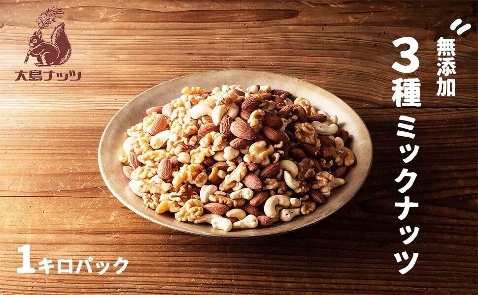 ミックスナッツ 素焼き 無塩 1kg 3種 均等配合(アーモンド くるみ カシュー)油不使用 大島ナッツ