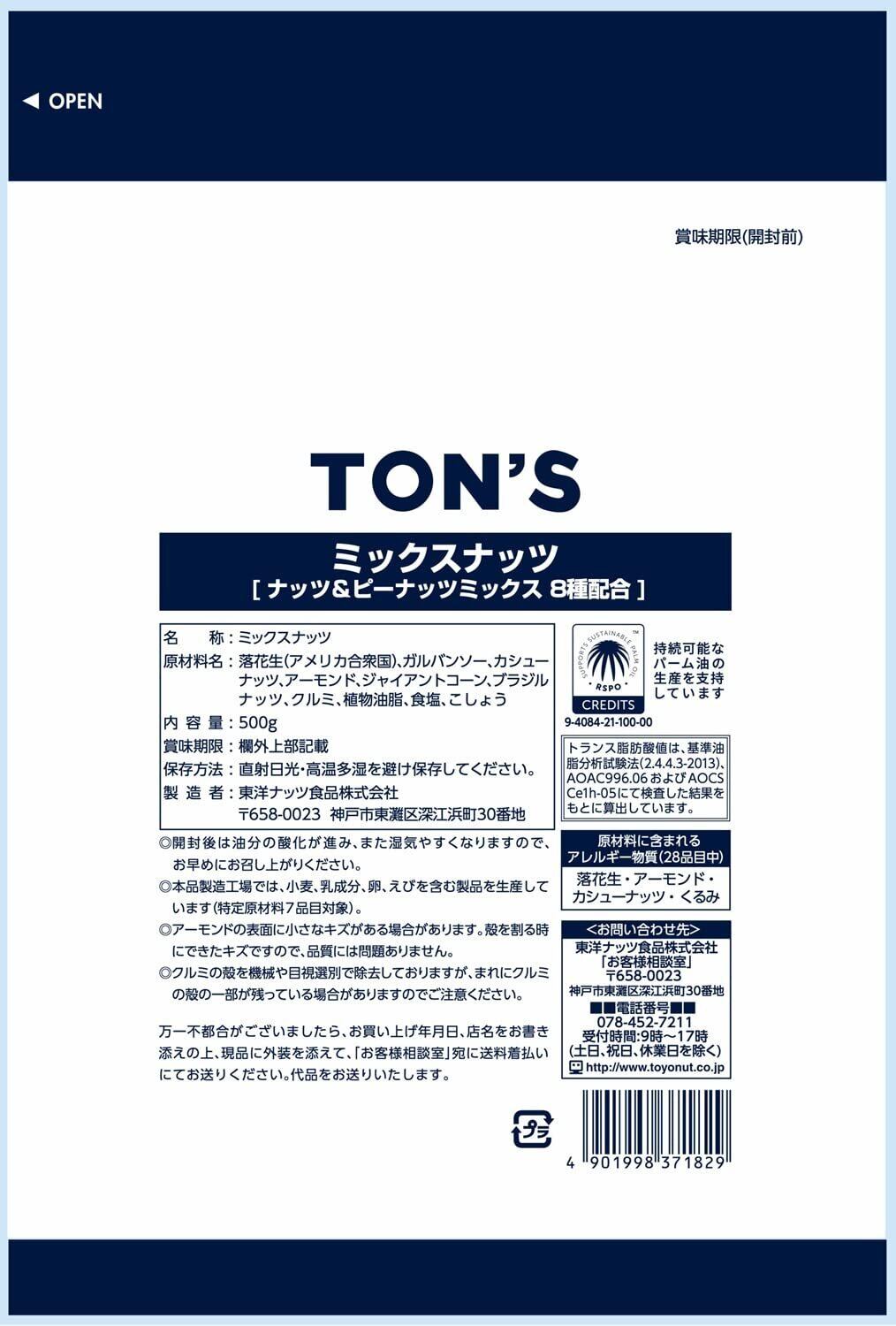 原材料:落花生(アメリカ産)、ガルバンソー、カシューナッツ、アーモンド、とうもろこし、ブラジルナッツ、クルミ、植物油脂、食塩、白こしょう、調味料(アミノ酸等)