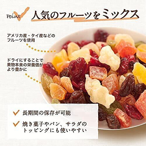 パイン、パパイヤ、マンゴーの10mmカット、クランベリー、レーズン、グリンレーズンのドライフルーツミックスです。お菓子作りやサラダのトッピングにご利用ください。