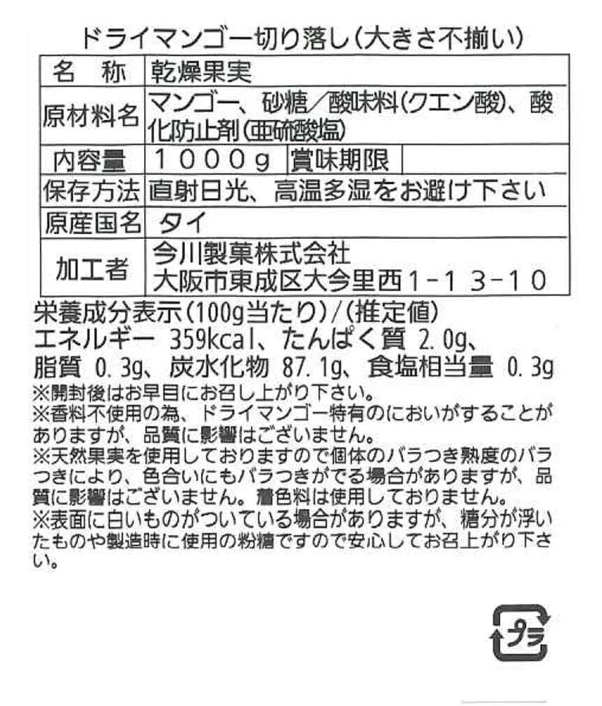 今川製菓 ドライマンゴー 切り落とし 1kg ドライフルーツ マンゴー 業務用 チャック袋 入り (大きさ不揃い)