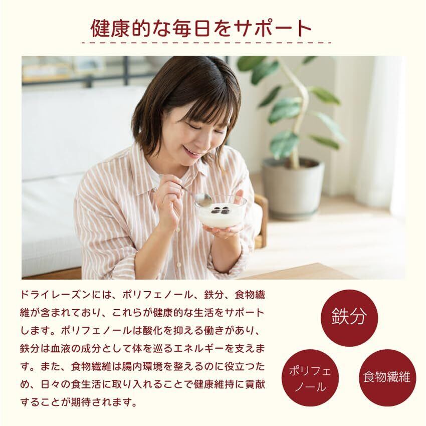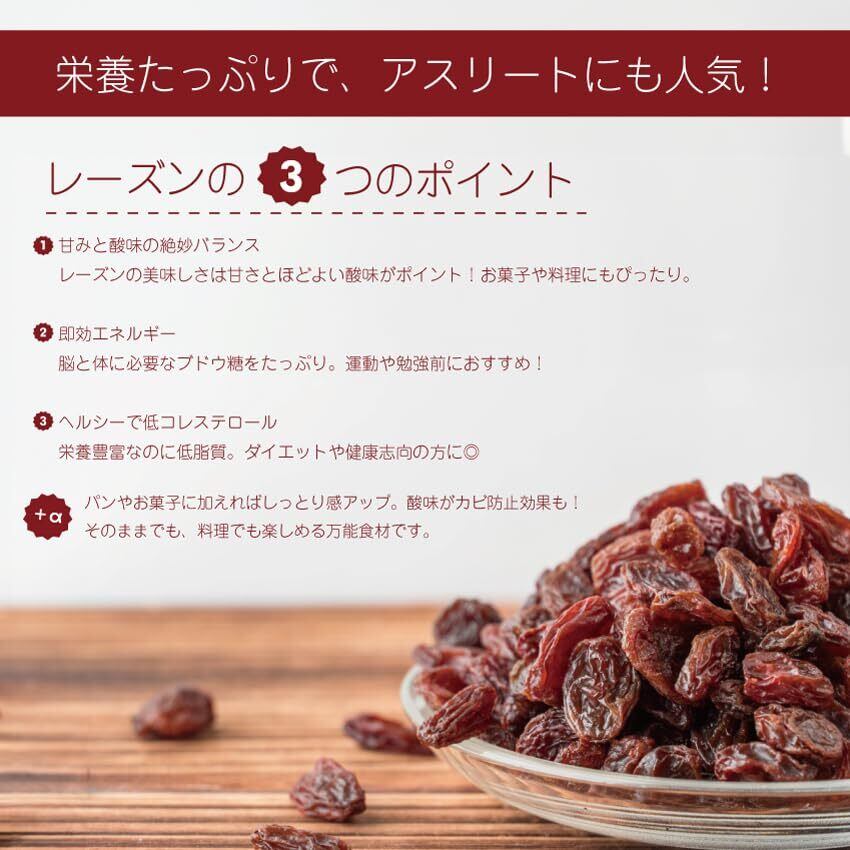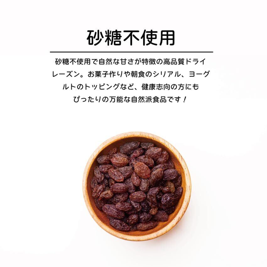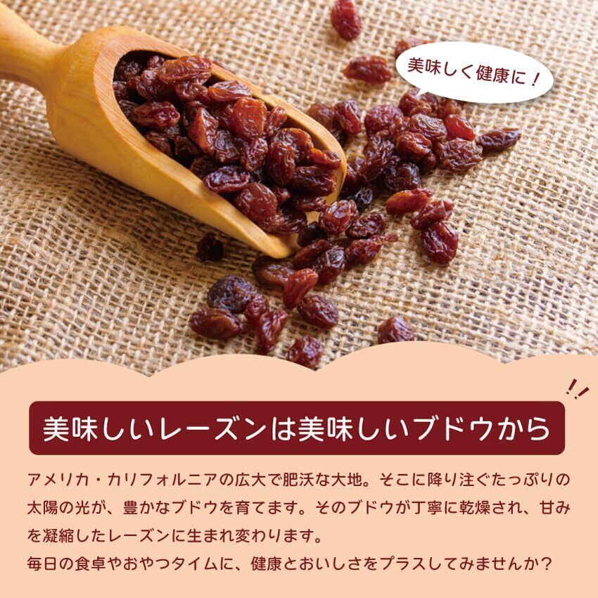 カリフォルニアの豊かな土地で育った芳醇な味わいのレーズン ブドウの栄養をギュッと閉じ込めたレーズンは健康・美容オススメ 女性にとって欠かせない アントシアニン や ポリフェノール の美容成分が含まれています レバーやプルーンにも含まれる鉄分はレーズンにも多く含まれています ※房等の除去には細心の注意を払っておりますが、稀に残ることがあります。予めご了承下さい 1日の摂取量目安:30g程度 甘みと酸味の二重奏。そのまま食べても美味しい。
