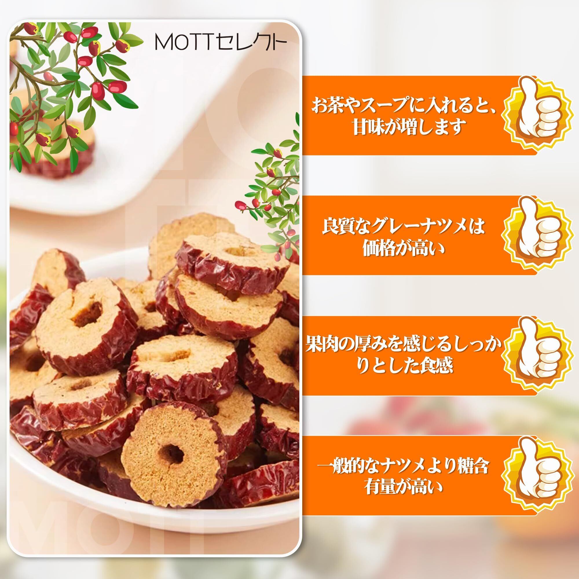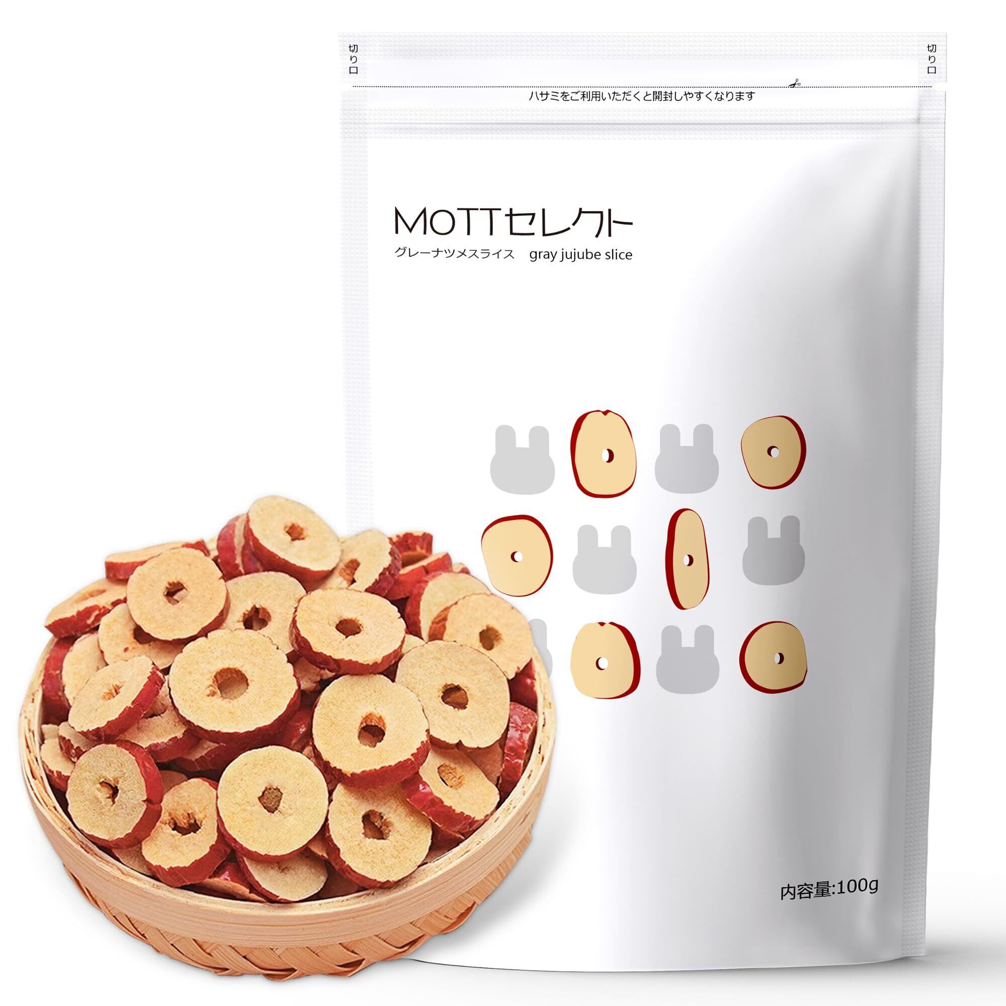 【厳選したナツメで加工】MOTTセレクトのなつめは、1級のグレー ナツメをスライスしています。グレーナツメはなつめの中で最も軽食に適した品種で、価格は少し高めですが、甘くて柔らかくもちっとした食感が特徴です。ナツメチップスにすることにより栄養成分が出やすくなり、なつめ茶やスープの調理に適しています。