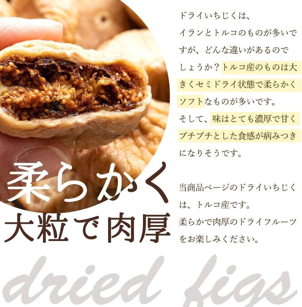 濃厚な味とプチプチッとした食感が病みつきになる、やわらかで大粒・肉厚なドライフルーツです。トルコ産のドライ いちじくですので、味は甘味が強く、粒は大粒で皮が柔らかく果肉が多いのが特徴です。柔らかいので食べやすく、粒が大きめなので一粒でも十分な食べ応えがございます。また、【無添加 砂糖不使用】 です! ドライいちじくの一日の摂取量の目安は、およそ2~3個程度です。食物繊維も豊富に含まれておりますので、おなかがゆるくなったりする場合がございますので、ご注意ください。