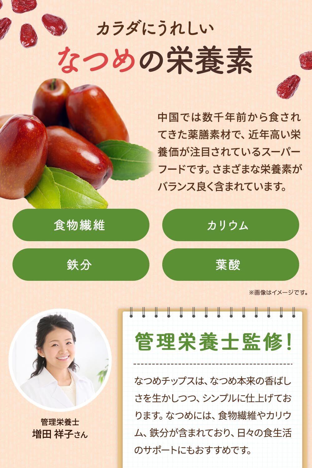 【ナツメチップスならアレンジしても美味しい】食べやすいサイズが特徴。小さめのカットで食べやすい!おやつにもピッタリです。保存に便利なチャック付きアルミパッケージを使用。※硬さがあるため、歯の弱い方はご注意ください。※衝撃を受けて割れたり、欠けたりすることがあります。※一度に食べ過ぎると、ご体質により、胃腸に刺激を与える場合がありますので注意ください。※天然由来のため、収穫年や商品ごとに色、味、香りにバラつきが生じることがありますが、品質には問題ありません。※種は取り除いていますが、まれに種や種の破片が残っている場合がありますので、お召し上がりの際はご注意ください。
