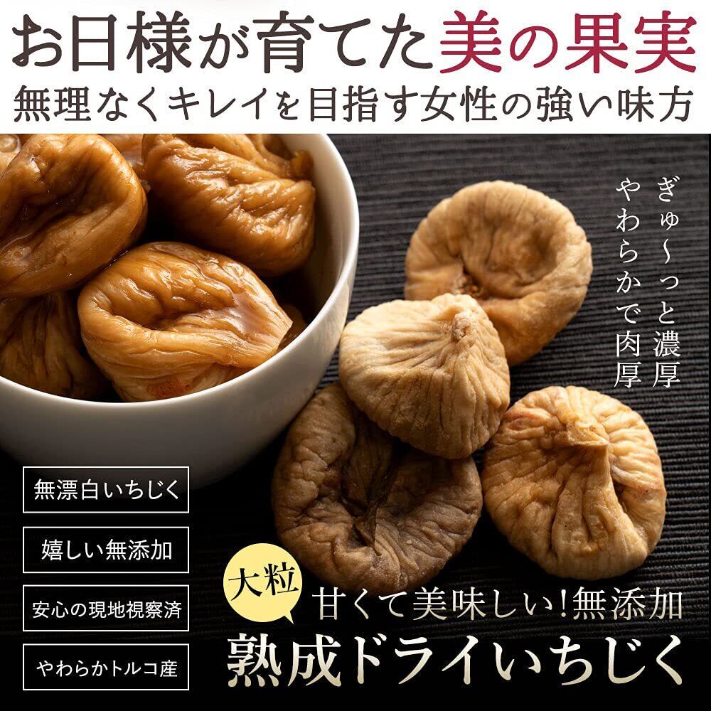 商品説明:濃厚な味とプチプチとした食感が病みつきになる、やわらかで大粒・肉厚なドライフルーツです。トルコ産のドライ いちじくですので、味は甘味が強く、粒は大粒で皮が柔らかく果肉が多いのが特徴です。柔らかいので食べやすく、粒が大きめなので一粒でも十分な食べ応えがございます。また、無添加 砂糖不使用 ですので、健康は気になるけど余分なものは摂りたくない方、ダイエット等で糖質を気にされている方にも、安心してお召し上がりいただけます。 ドライいちじくの一日の摂取量の目安は、およそ2、3個程度です。 食べ過ぎると、糖質の摂り過ぎにつながって逆に太ってしまったり、また、食物繊維も豊富に含まれておりますので、おなかがゆるくなったりする場合がございますので、ご注意ください。 チャック付なので保存に便利です