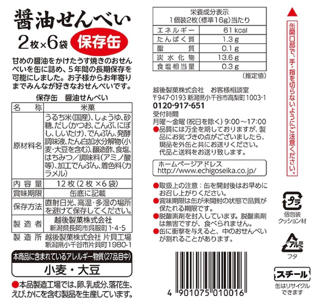 越後製菓 保存缶 醤油せんべい 12枚(2枚×6袋)