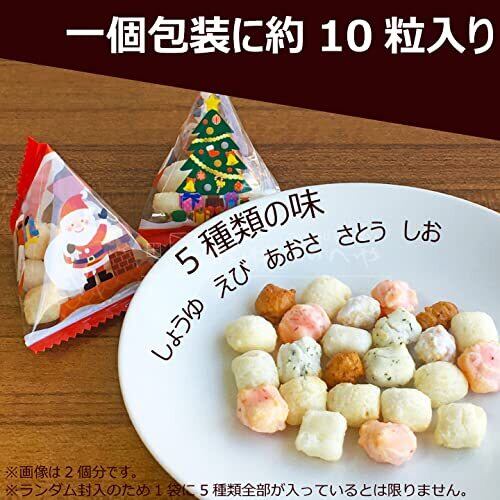 サンタクロースやトナカイなどクリスマスの様々なイラストがプリントされた小袋に小粒あられが入っています。 ※小袋のデザインはランダム封入の為、全種類入っているとは限りません。
