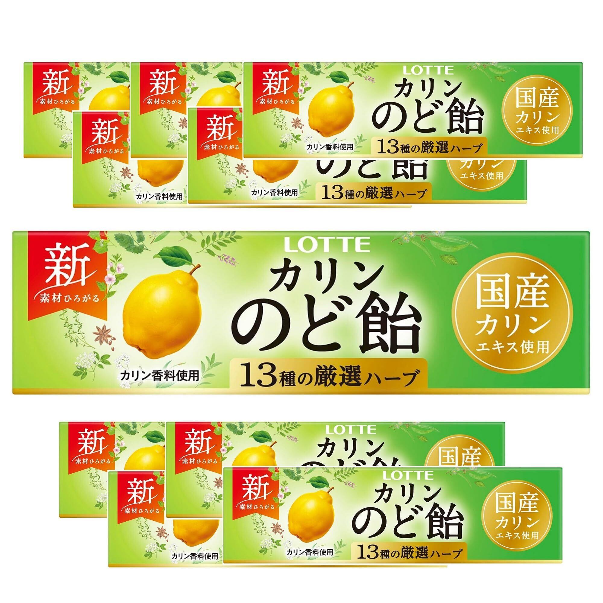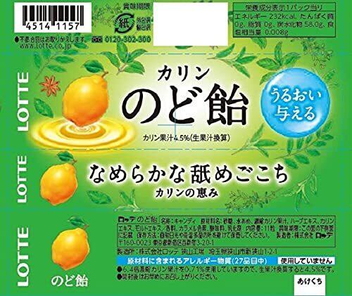 原材料:砂糖、水あめ、ハーブエキス、濃縮カリン果汁、モルトエキス、カリンエキス、香料、カラメル色素、乳化剤、調味料(アミノ酸)、(原材料の一部に大豆を含む)