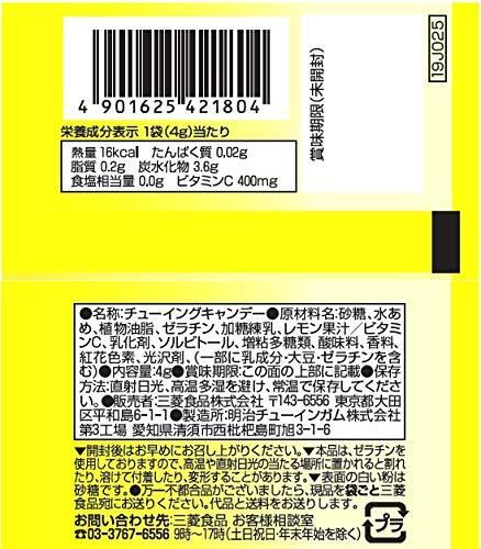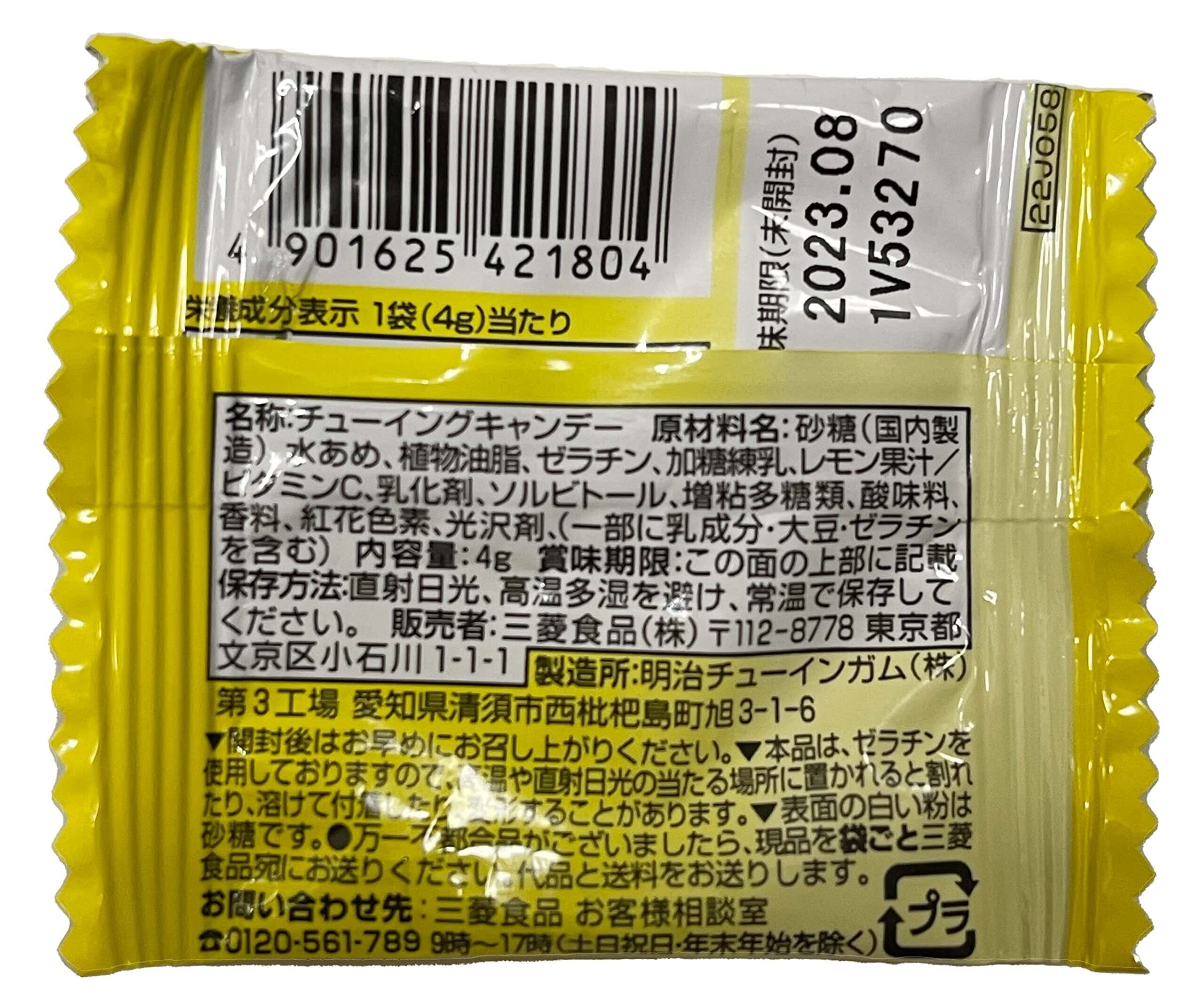 原材料:砂糖、水あめ、植物油脂、ゼラチン、加糖練乳、レモン果汁/ビタミンC、乳化剤、ソルビトール、増粘多糖類、酸味料、香料、紅花色素、光沢剤、(一部に乳成分・大豆・ゼラチンを含む)