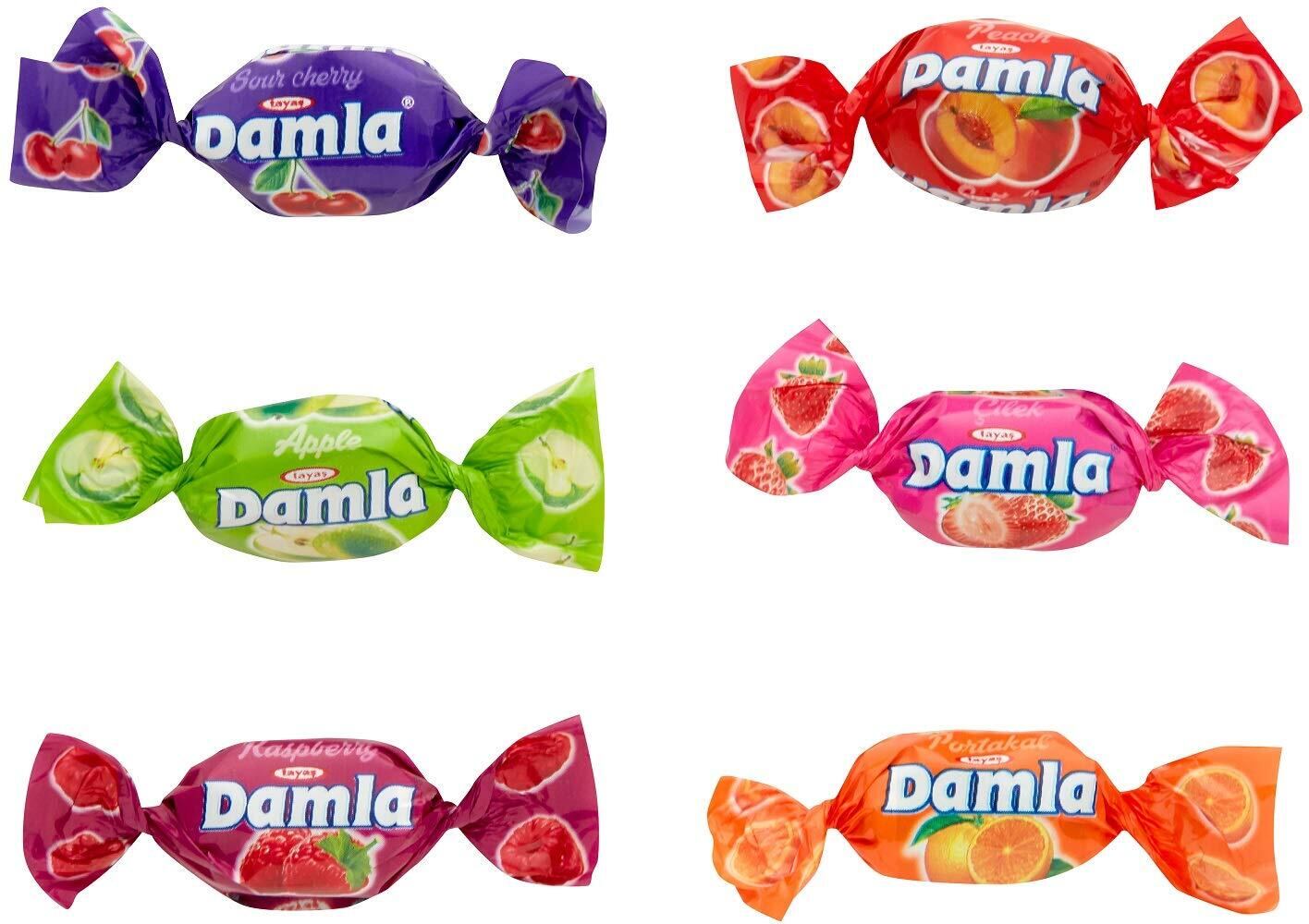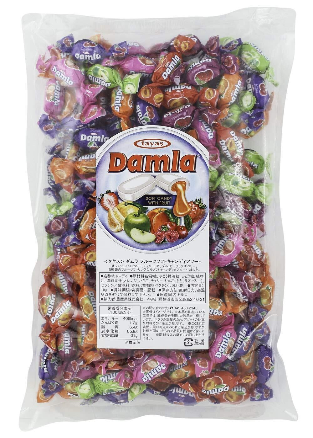 6種類(オレンジ、アップル、ストロベリー、チェリー、ピーチ、ラズベリー)のフルーツフィリング入りソフトキャンディーをアソートしました。<br>ダムラキャンディを製造する「タヤス社」は1965 年にトルコ中央部の小さなワークショップから始まり、1991 年に現在の近代的な設備工場へ移転しました。<br>現在では トルコおよび世界中のコンパウンドチョコレート、キャンディー製品の重要な生産者の1つになり、国際市場で大きな成功を収めています。