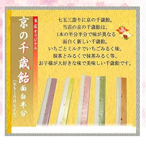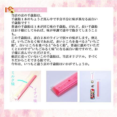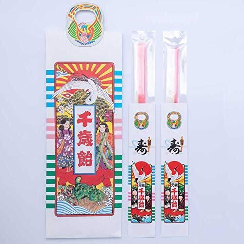 当店自社製造のオリジナル千歳あめ!飴の赤白2本のラインで別々の味です。赤い部分は”いちご飴”、白いところは"みるく飴"。普通に舐めていただくと口の中で”いちごみるく味”になる面白い飴ですので、お子様に喜んでいただけます。手提げ袋の長さは約43cmありますので、お子様が手に持って写真撮影されるご用途にも最適です。(あまり長すぎると、お子様が引きずってしまわれることもあり、43cmは一般的な長さとなります) 本品は、手提げ大袋1セットです( 手提げの大袋1袋に千歳飴(いちごみるく味約28g)2本が入っている仕様です。)