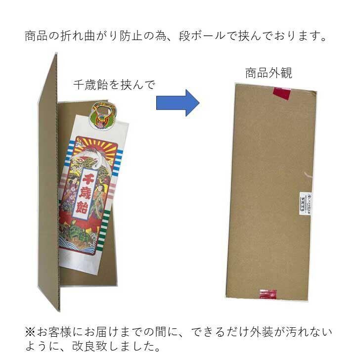新梱包:千歳飴の外袋全体を、ボール紙で覆うように改良致しました。(千歳飴外袋や持ち手の折れ曲がり防止、汚れ防止の為)商品写真ご参照下さい