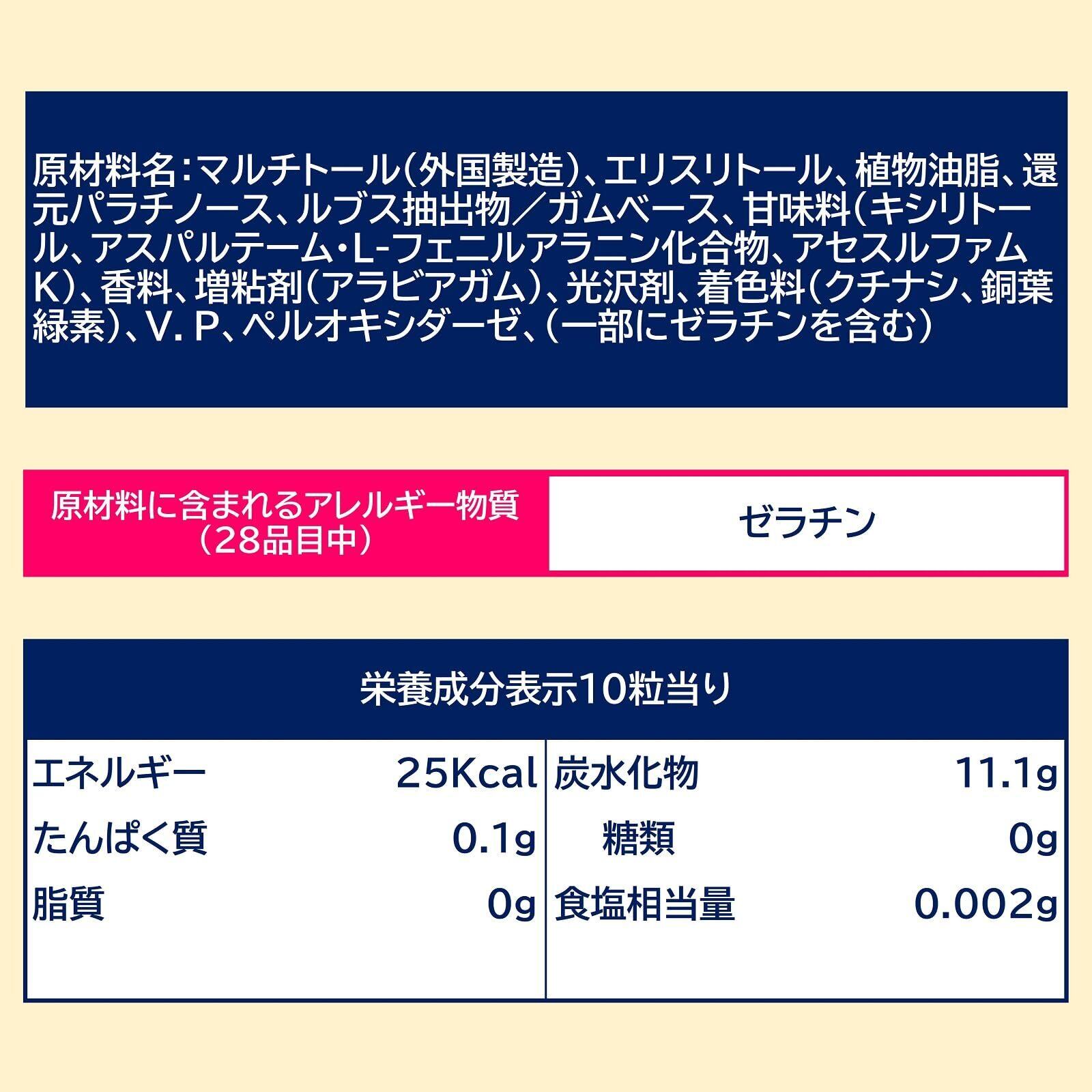 マルチトール(外国製造)、エリスリトール、植物油脂、還元パラチノース、ルブス抽出物/ガムベース、甘味料(キシリトール、アスパルテーム・L-フェニルアラニン化合物、アセスルファムK)、香料、増粘剤(アラビアガム)、光沢剤、着色料(クチナシ、銅葉緑素)、V.P、ペルオキシダーゼ、(一部にゼラチンを含む)