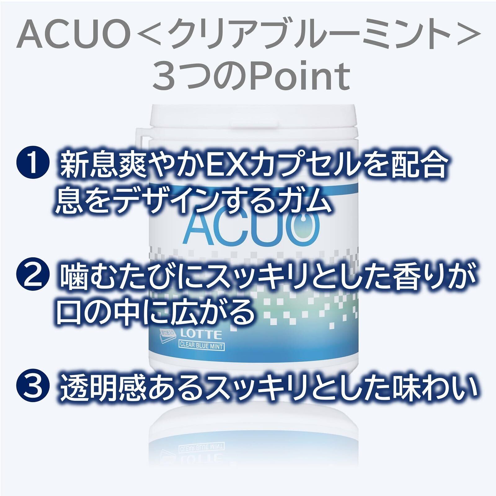 爽やかなミントの香りに加えて、新息爽やかEXカプセルを配合した、息をデザインするガムです。新カプセルを配合することで、噛むたびにスッキリとした香りが口の中に広がる品質です。クリアブルーミントの特徴である透明感あるスッキリとした味わいを是非お楽しみください。デスクや車に常備してみてください。ACUOは前向きで爽やかな毎日をサポートします。