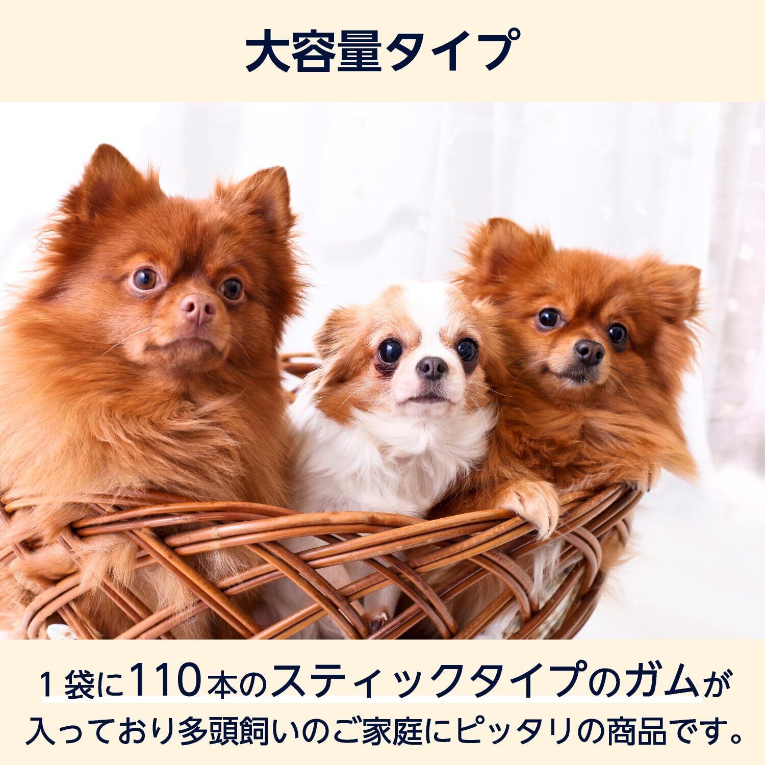 ・ガムを手で持ち、口の横から少しずつ与えてください。歯垢がたまりやすい奥歯は左右で偏りがないように噛ませてください。前歯などもまんべんなく噛ませるようにしてください。