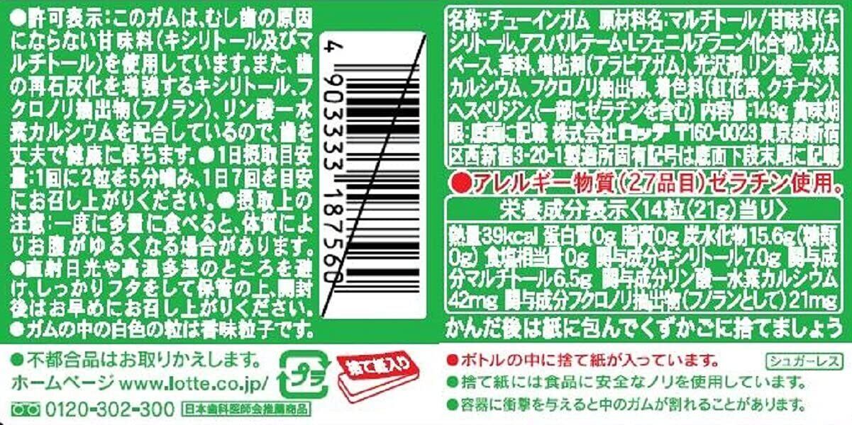 【トクホ】ロッテ キシリトールガム(ライムミント)ファミリーボトル 143g×3個