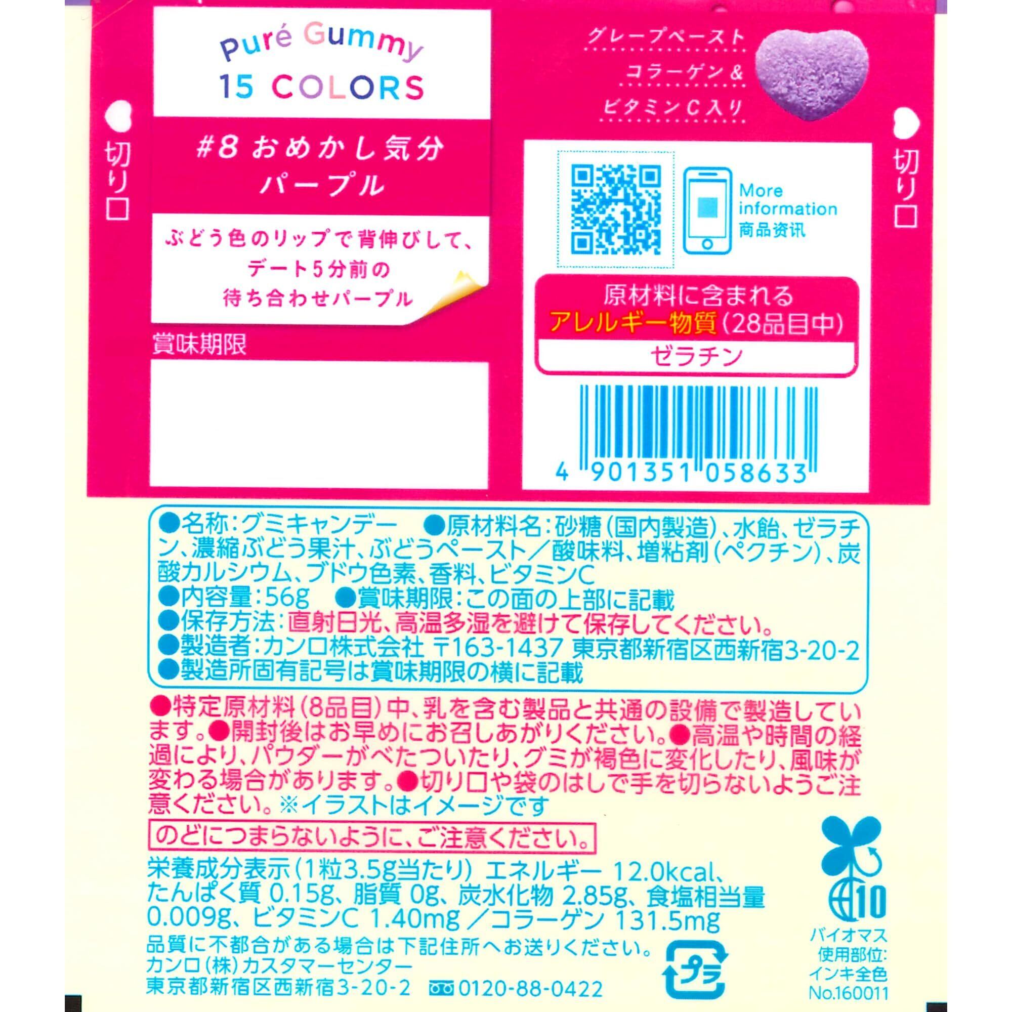 砂糖(国内製造)、水飴、ゼラチン、濃縮ぶどう果汁、ぶどうペースト/酸味料、増粘剤(ペクチン)、炭酸カルシウム、ブドウ色素、香料、ビタミンC