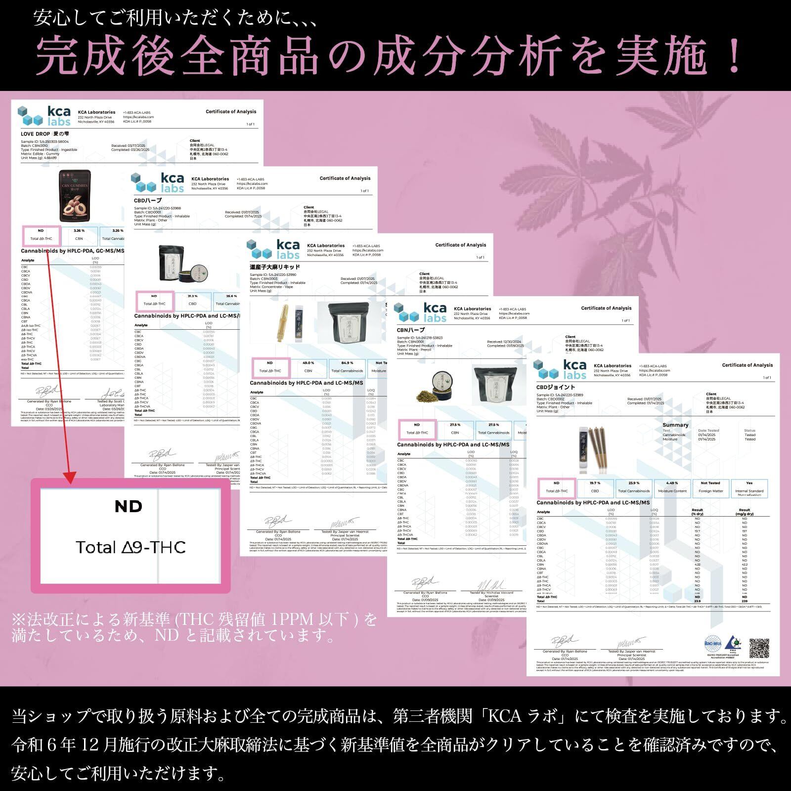 【安心感を大切に、日本国内で製造】 完成商品は、第三者機関(KCAラボ)にて検査を実施しております。 令和6年12月施行も改正大麻取締法に基づく新基準値をクリアしていることを確認済みです。