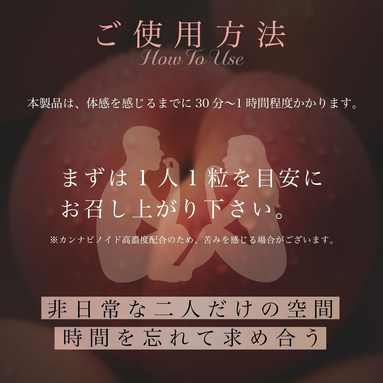 【使用上のご注意】初めてご利用になる際は、必ず1粒からお試しください。体感には個人差があり、ご自身に合った量でのご使用をおすすめします。初回で変化を感じにくい場合でも、一度に複数粒を摂取することはお控えください。また、ご使用後は車の運転や機械操作などを控えていただくことを推奨しております。