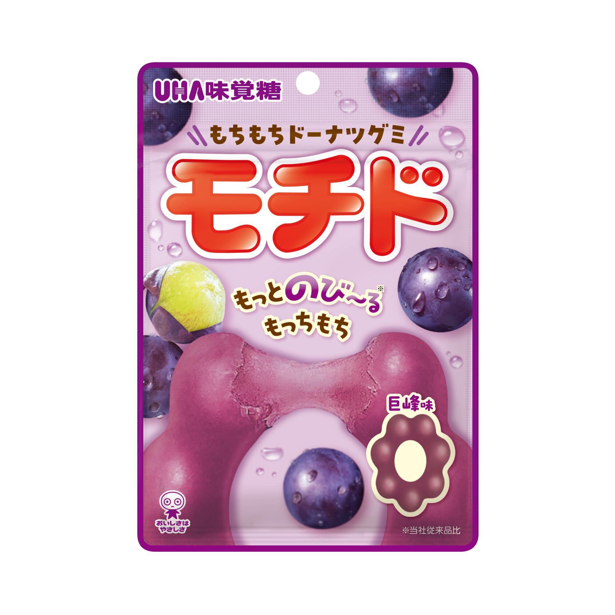 ●もちもちドーナツグミ「モチド」がリニューアル! モチドがさらにのび~るもちもち食感にバージョンアップしました。 もちもちとした伸びる食感で、まるでもちもちリングドーナツ!? ●巨峰味 こだわり果汁使用しております。巨峰は甘さと酸味のバランスが良く、豊かな香りが特徴です。