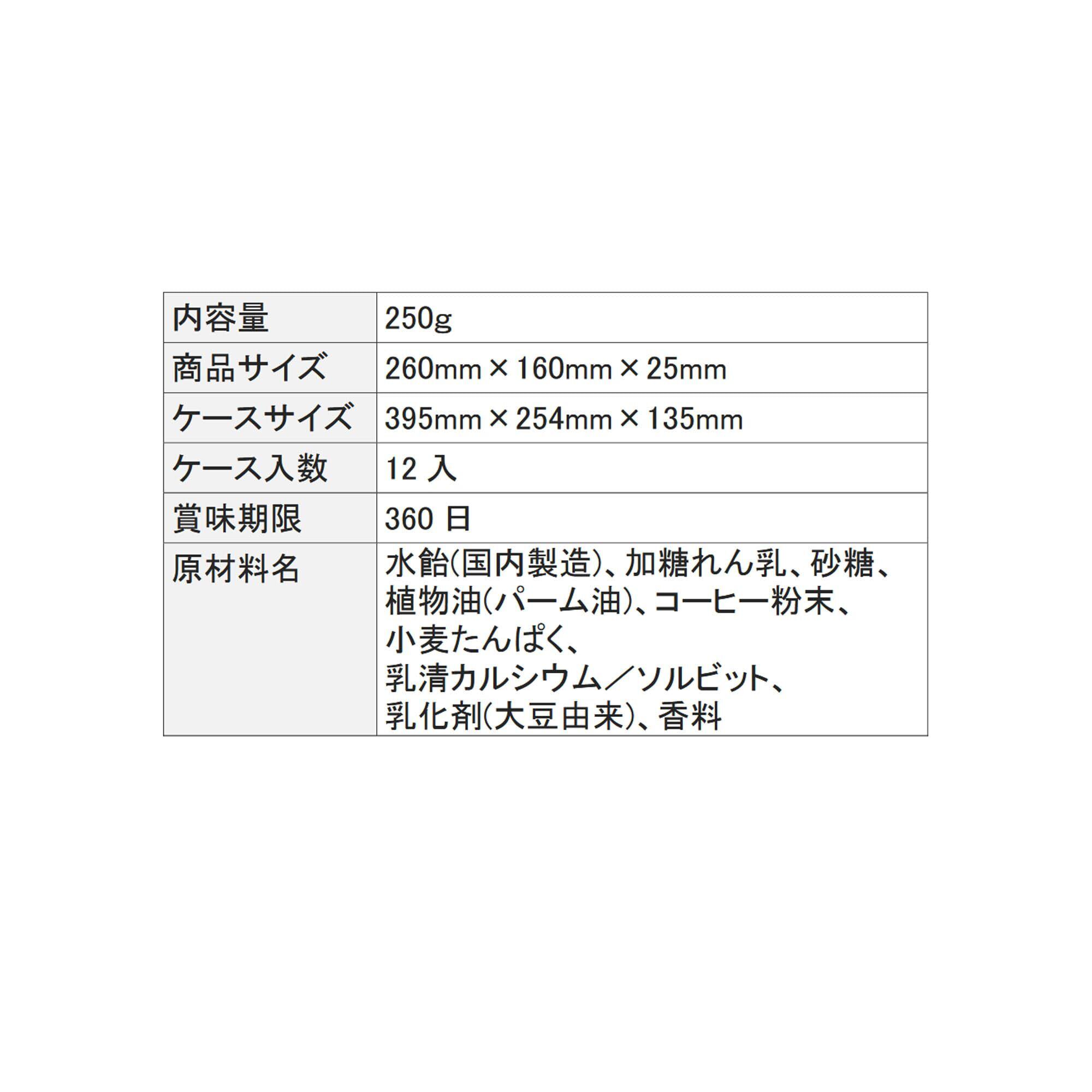 水飴、加糖れん乳、砂糖、植物油(パーム油)、コーヒー粉末、小麦たんぱく、乳清カルシウム/ソルビット、乳化剤(大豆由来)、香料