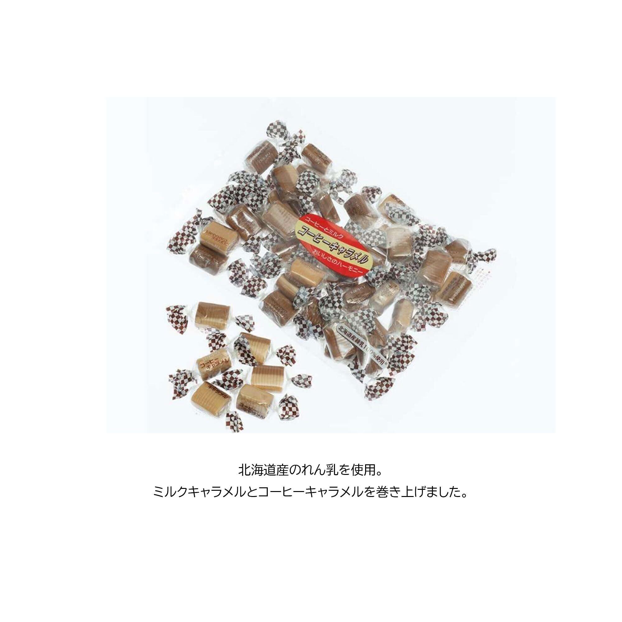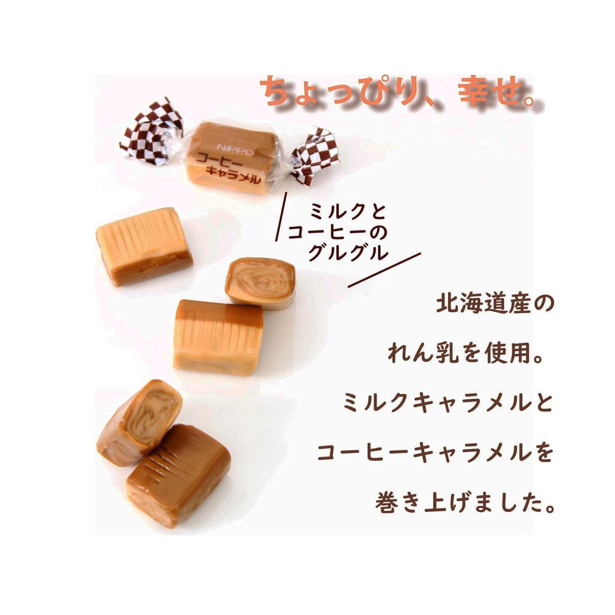 北海道産の練乳を使用し、風味豊かなコクのあるミルク味のキャラメルと、コーヒー味のキャラメルを一つにあわせました。小さなお子様から、お年寄りまで皆さんで楽しんで頂ける味です。
