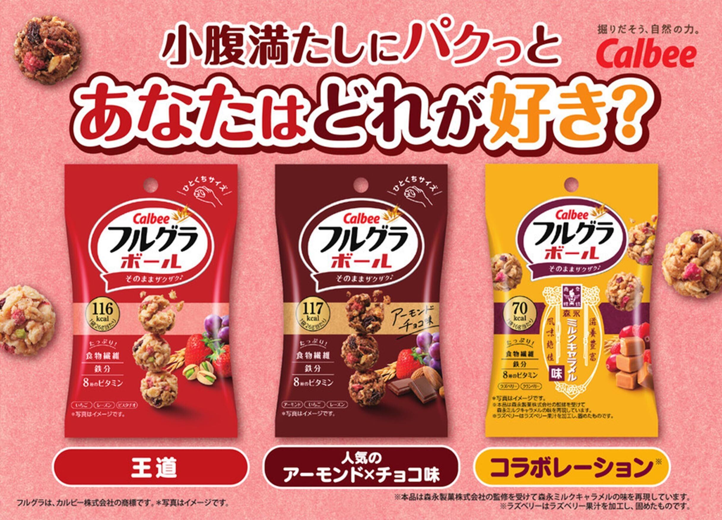 フルグラがひとくちサイズにま~るくなった!キャラメルの程よい甘さとミルクの優しい味をベリーの酸味が引き立てます。