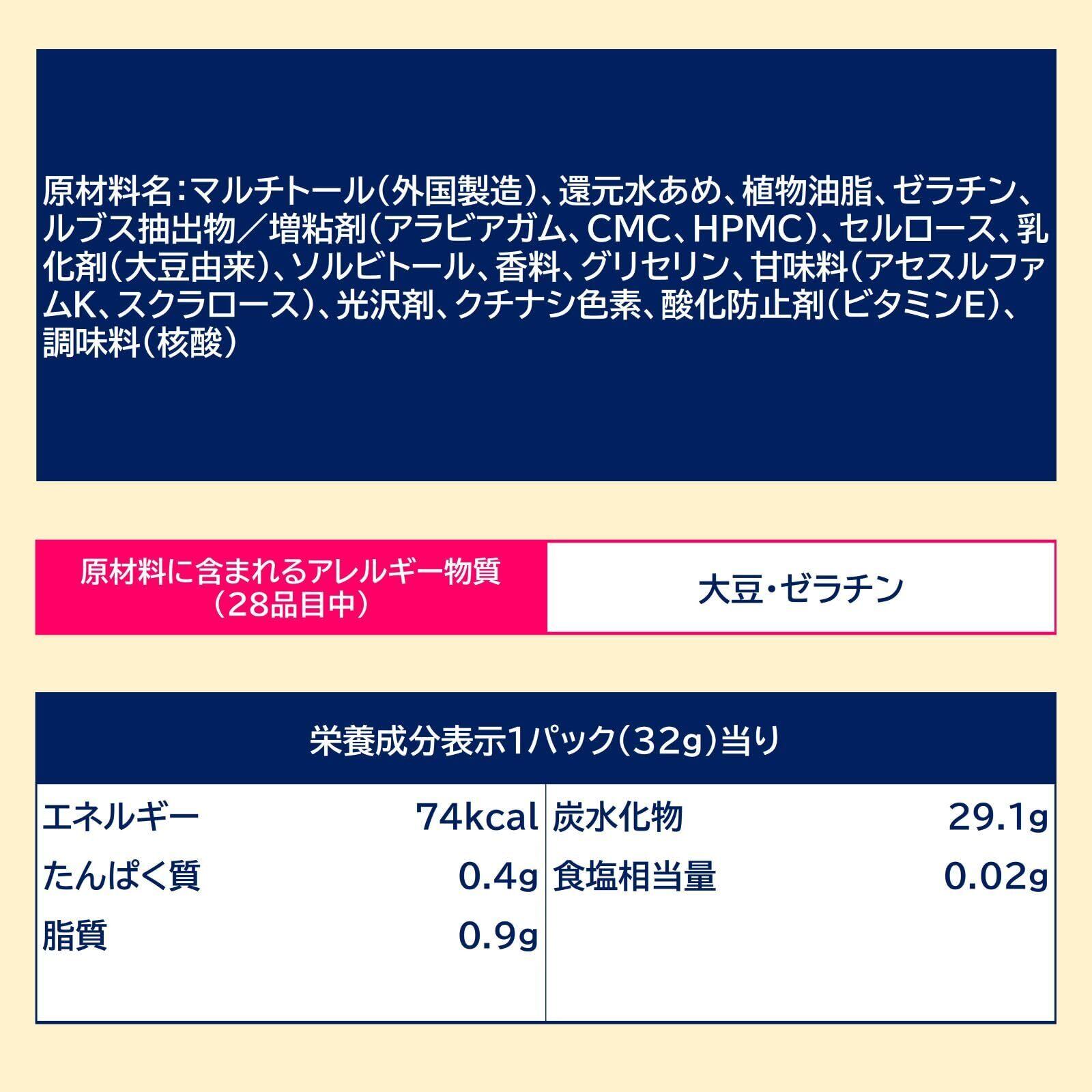 原材料:マルチトール(外国製造)、還元水あめ、植物油脂、ゼラチン、ルブス抽出物/増粘剤(アラビアガム、CMC、HPMC)、セルロース、乳化剤(大豆由来)、ソルビトール、香料、グリセリン、甘味料(アセスルファムK、スクラロース)、光沢剤、クチナシ色素、酸化防止剤(ビタミンE)、調味料(核酸)