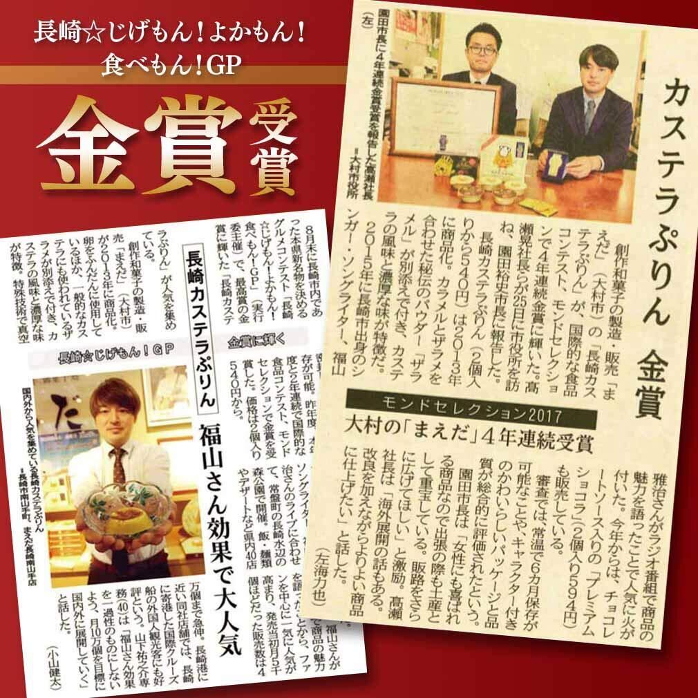 圧倒的な人気で累計販売個数2,153,567個を突破。 信頼と実績のある明治30年創業の老舗創作和菓子店まえだから、 主力商品のカステラをより多くの方に楽しんで頂けるよう、 新しい長崎名物の開発に尽力し完成した「カステラぷりん」。