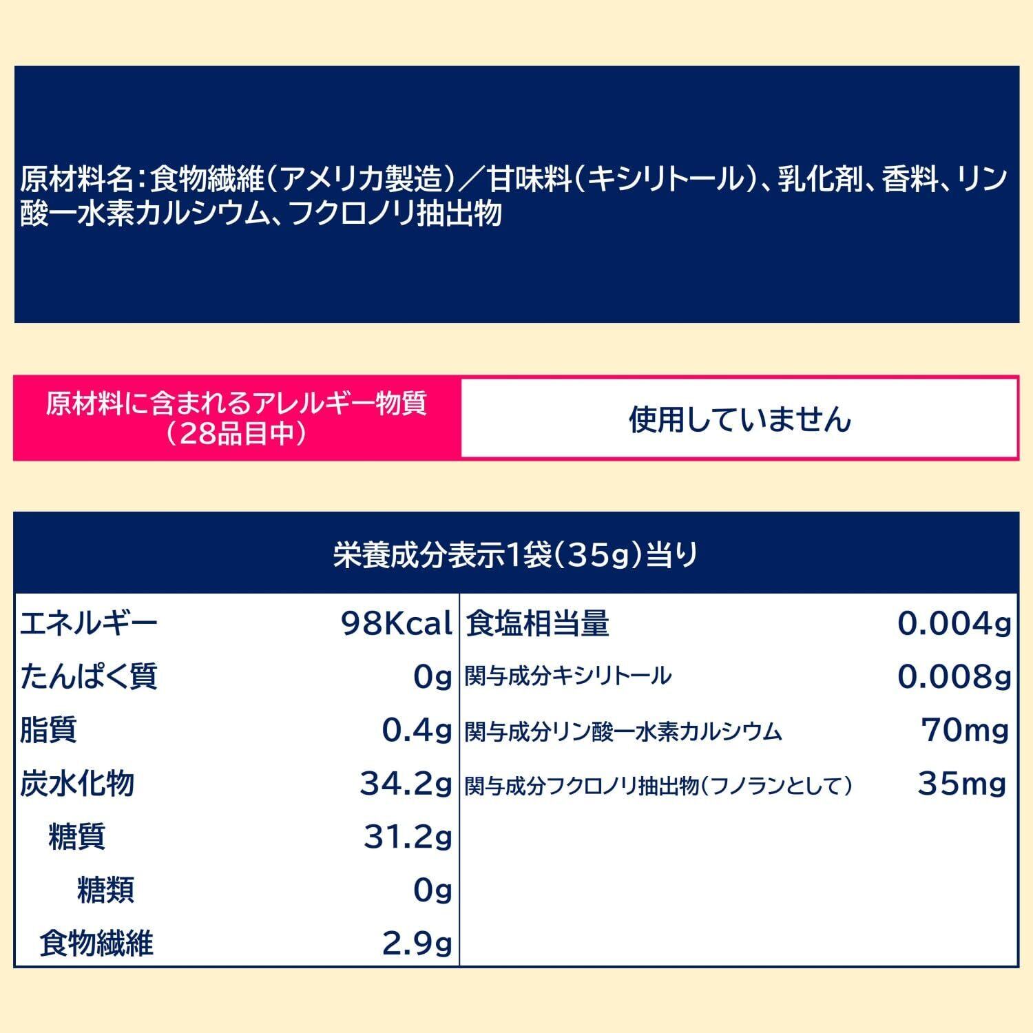 原材料:食物繊維(アメリカ製造)/甘味料(キシリトール)、乳化剤、香料、リン酸一水素カルシウム、フクロノリ抽出物