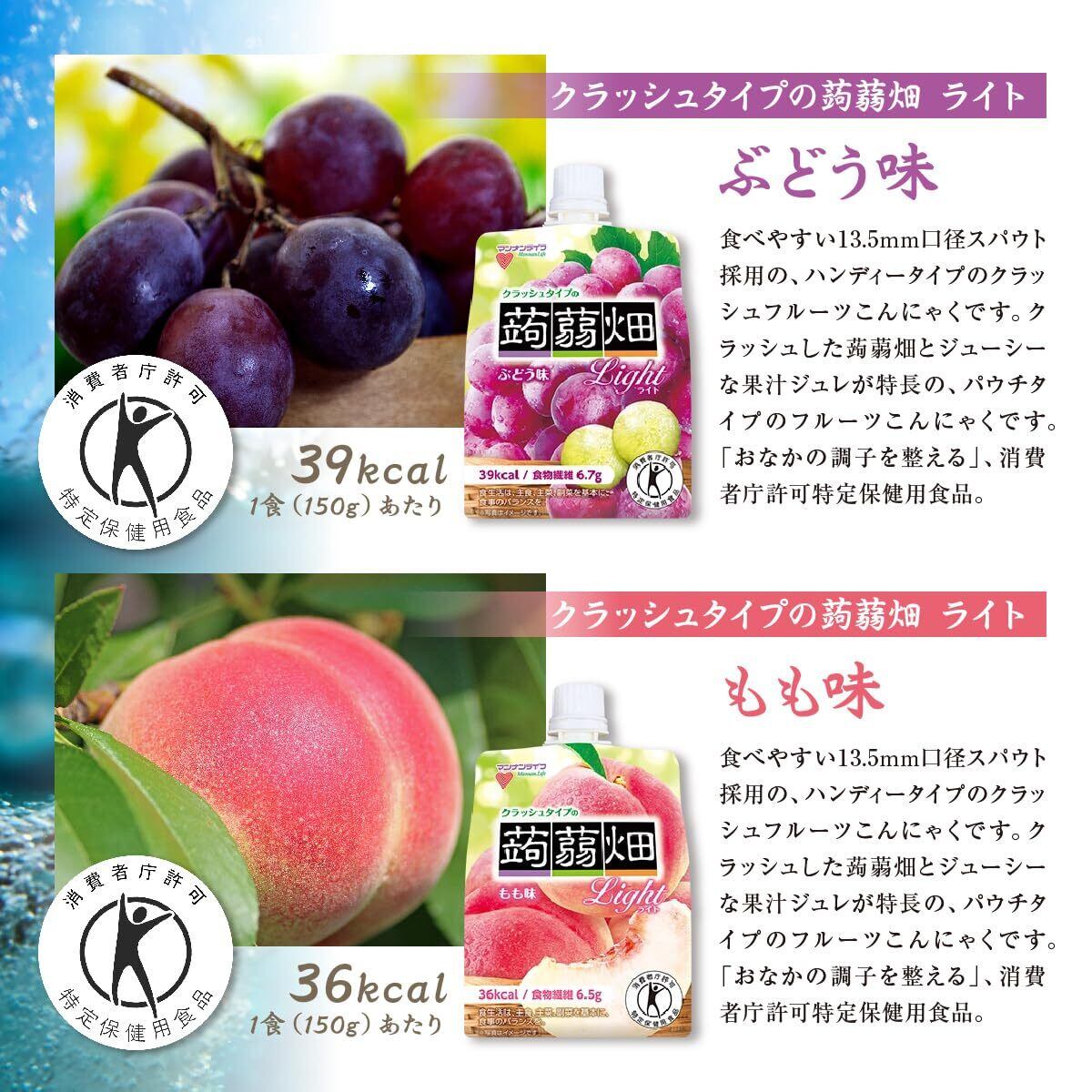 【クラッシュタイプの蒟蒻畑 ライト もも味】食べやすい13.5mm口径スパウト採用の、ハンディータイプのクラッシュフルーツこんにゃくです。クラッシュした蒟蒻畑とジューシーな果汁ジュレが特長の、パウチタイプのフルーツこんにゃくです。「おなかの調子を整える」、消費者庁許可特定保健用食品。1食(150g)あたりに食物繊維が6.5gも入って、カロリーはたった36kcal。香り高くジューシーなももを、丸ごとかじった時に広がる果実感を表現しました。