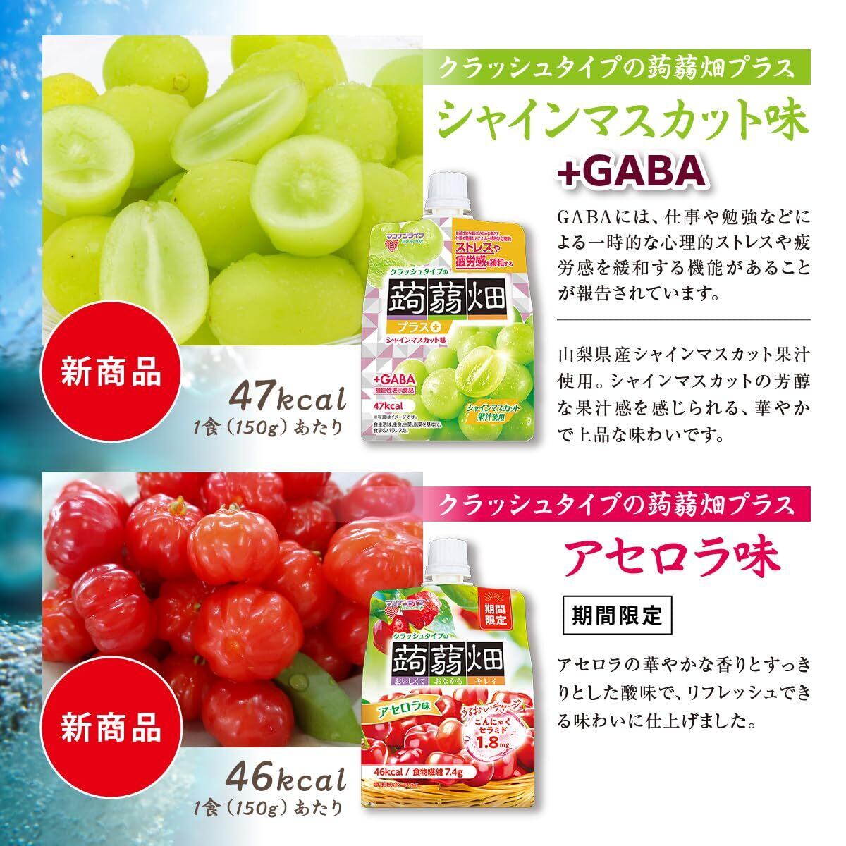 【機能性表示食品クラッシュタイプの蒟蒻畑プラスシャインマスカット味】 クラッシュした蒟蒻畑とジューシーなジュレが特長のパウチタイプのフルーツこんにゃくです。 機能性関与成分GABAの働きで仕事や勉強などによる一時的な心理的ストレスや疲労感を緩和します。 山梨県産シャインマスカット果汁使用。シャインマスカットの芳醇な果汁感を感じられる、華やかで上品な味わいです。