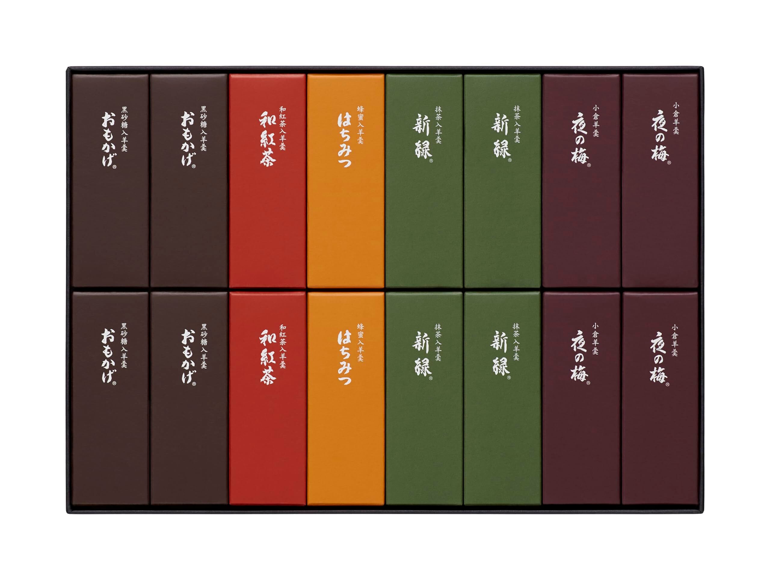 内容:小形羊羹「夜の梅」「おもかげ」「新緑」各4点、「はちみつ」「和紅茶」各2点の詰合せ