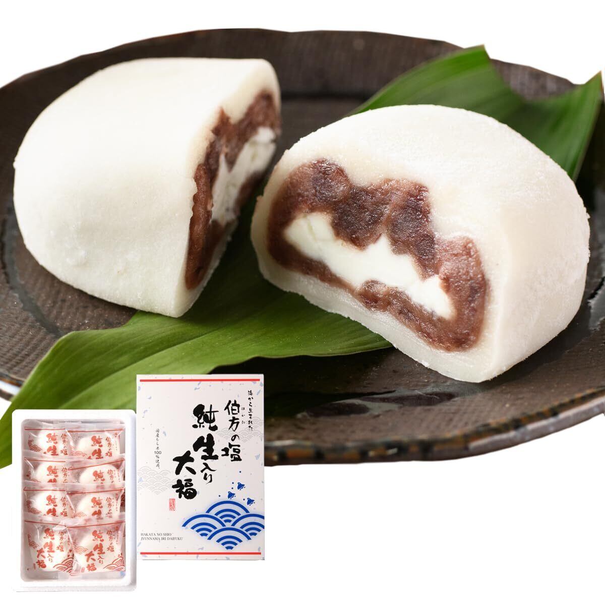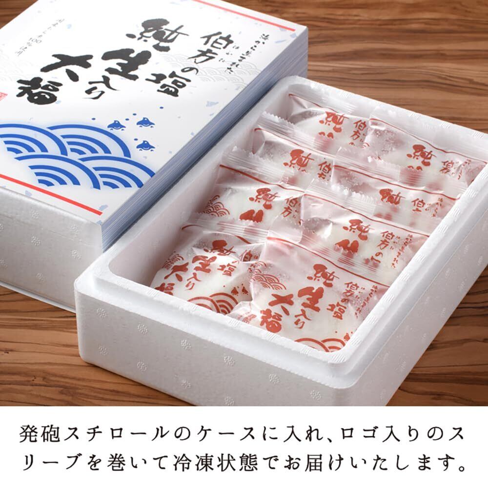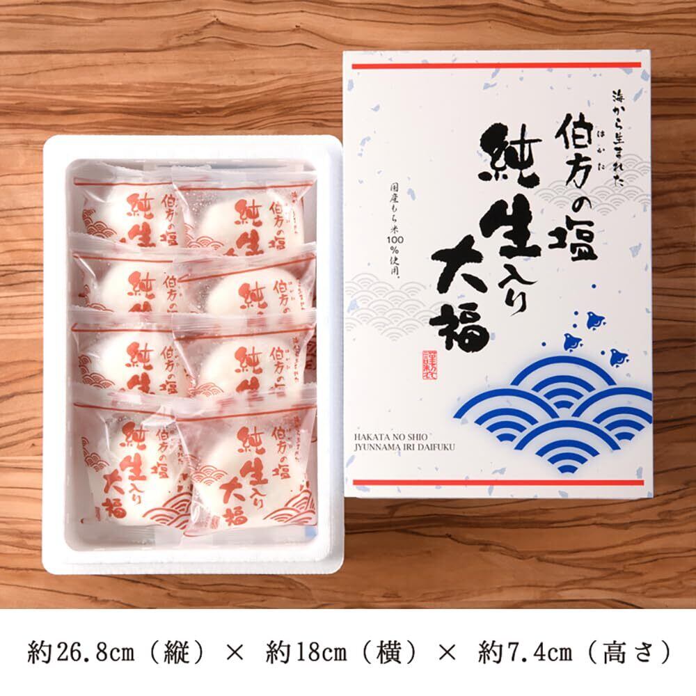 【内容】伯方の塩 純生入り大福(1個の大きさ:横約6.5cm×縦約6.0cm×高さ約2.5cm)8個入り。箱のサイズ:縦約26.8cm×横約18cm×高さ約7.4cm。ひとつずつ個包装し、お届けの箱は、発泡スチロールのケースに、伯方の塩純生大福ロゴ入りのスリーブを巻いて冷凍状態でお届けいたします。