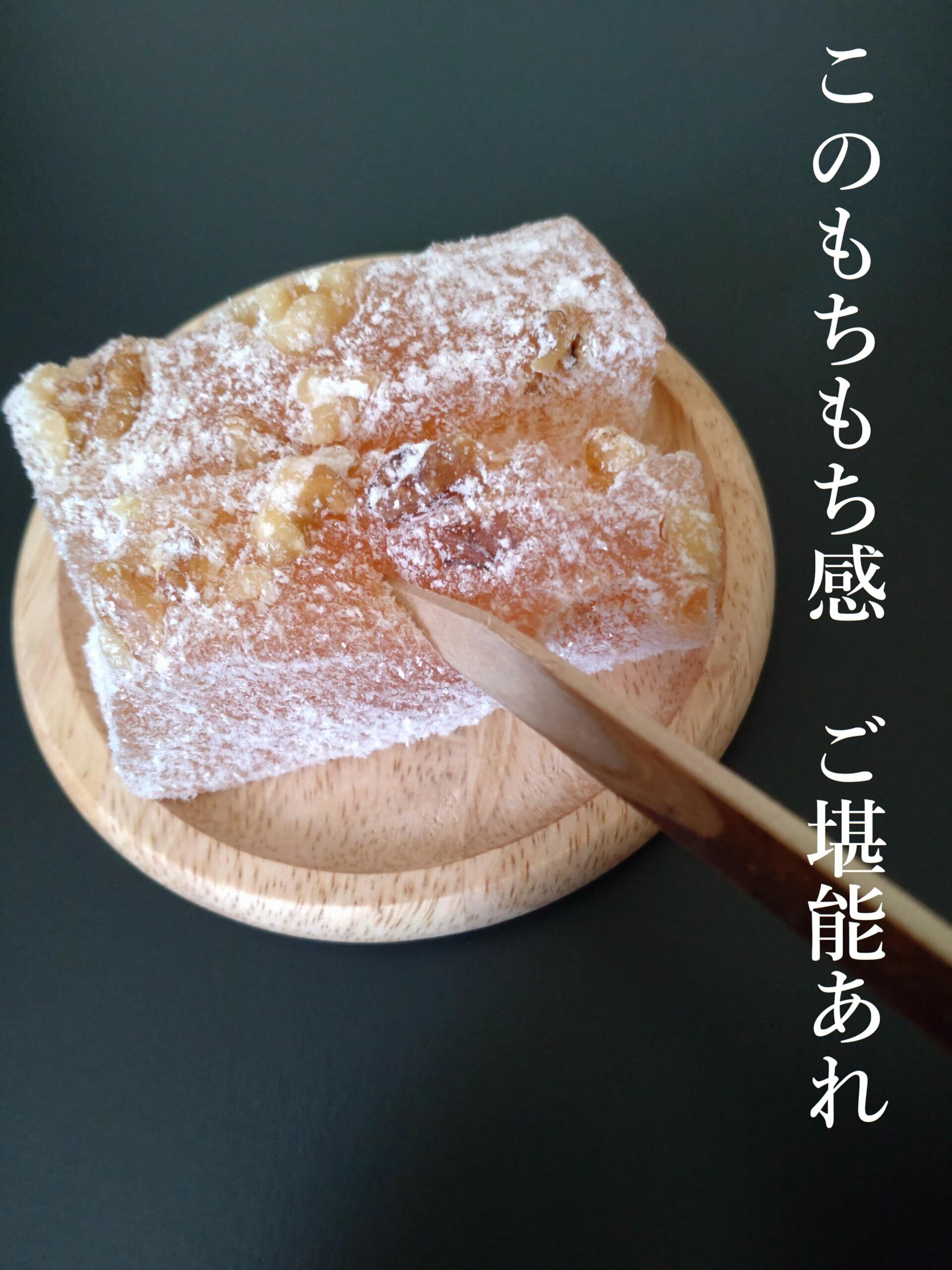・砂糖(国内製造)、水飴、餅粉、くるみ、粉末オブラート、澱粉/トレハロース、加工澱粉、乳化剤、増粘多糖類、(一部に乳成分・大豆・くるみを含む)