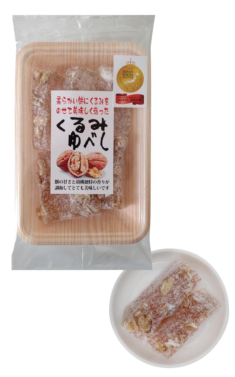 【審査員も絶賛 評価されたポイント】 ・柔らかい餅とくるみの軽快な食感の相性が良く素晴らしい ・とてもやさしい甘さとシンプルな味で飽きなくて良い ・オブラートの粉がキラキラしていて見た目が美しい ・保存料、着色料、香料不使用で安心感がある ・パッケージから取り出すときにくっつかない工夫は素晴らしい ・お抹茶は勿論、コーヒー、紅茶、マテ茶などにも合いそう ・パッケージの文字の雰囲気とくるみの画像が優しい印象 きなこ餅や信玄餅などの色々なお菓子がある中で以上の点で高い評価を頂き、ジャパンフードセレクション2025年1、金賞受賞となりました。
