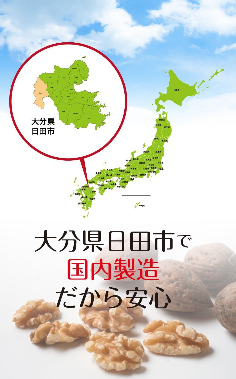 【日田の自然で誕生した だわりの素材】 豊かな自然に囲まれた大分県日田市で、厳選された素材を使用し伝統の製法で丁寧に作り上げました。 選び抜かれた素材をきめ細かく、もっちりとした食感になる様に独自にブレンドしています。 くるみは香ばしく風味豊かなものを厳選し、丁寧に加工することでより一層美味しさを引き出しています。