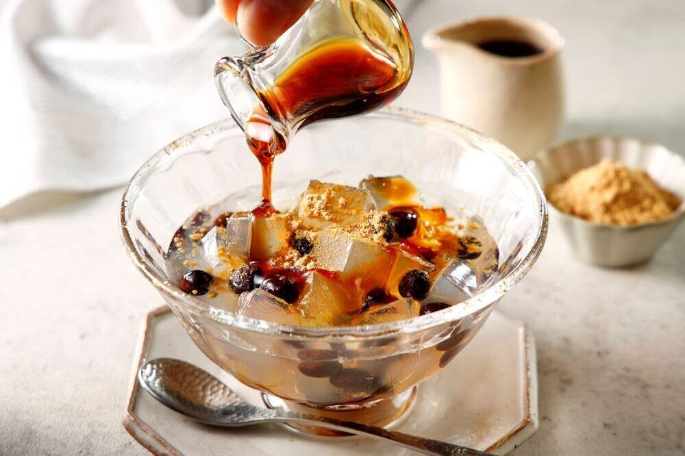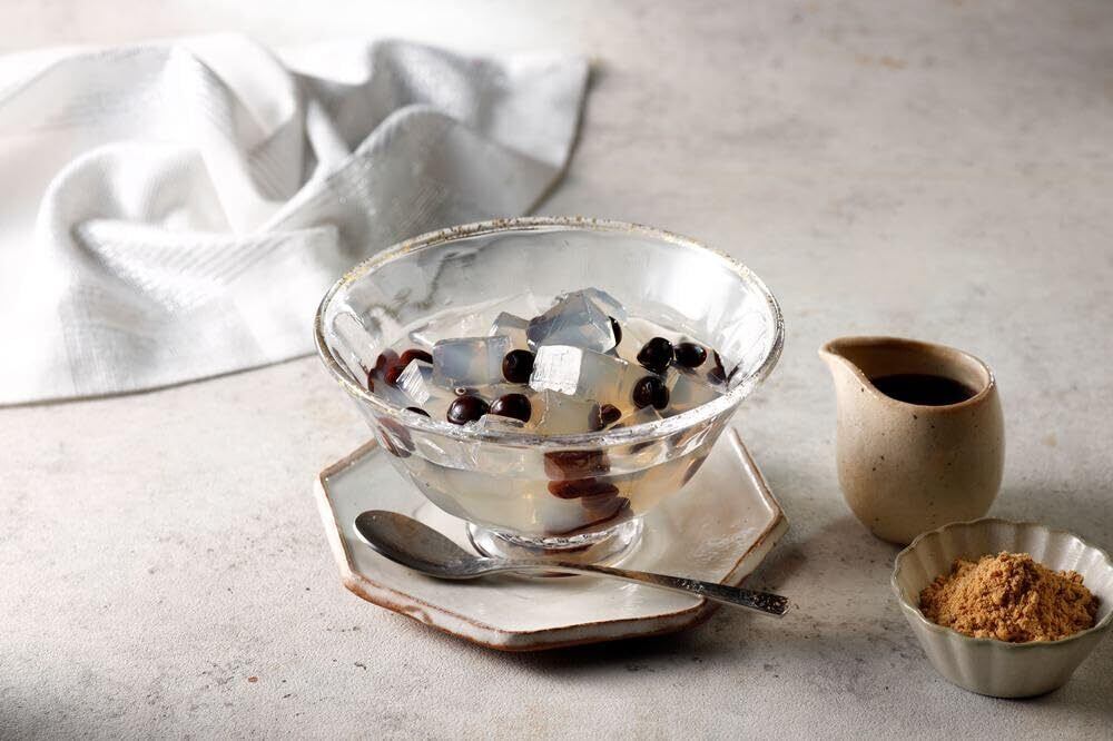 国産寒天と国産赤えんどう豆がたっぷり入った豆かんてん。国産きな粉、黒蜜付き。