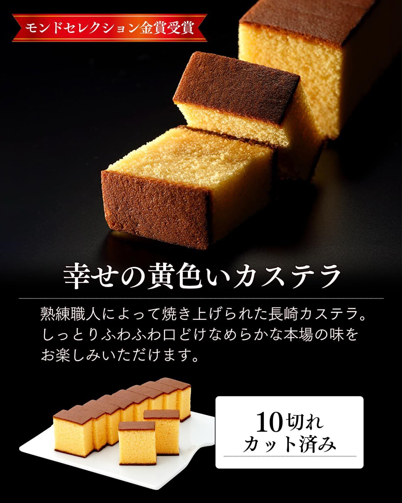 【商品特徴】幸せの黄色いカステラ・抹茶カステラ各1本(10切れカット済み)/1本の外寸:約7.0x27.5x7.0cm/1本の内容量:310g/包装紙:ギフト専用。/防腐剤不使用で安心してお召し上がりいただけます。直射日光、高温多湿を避けて保存してください。