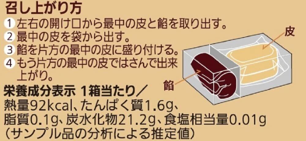 【小豆餡】グラニュー糖(国内製造)、小豆(北海道産)、還元水飴、水飴、寒天、食塩 【最中種】もち米(国産)