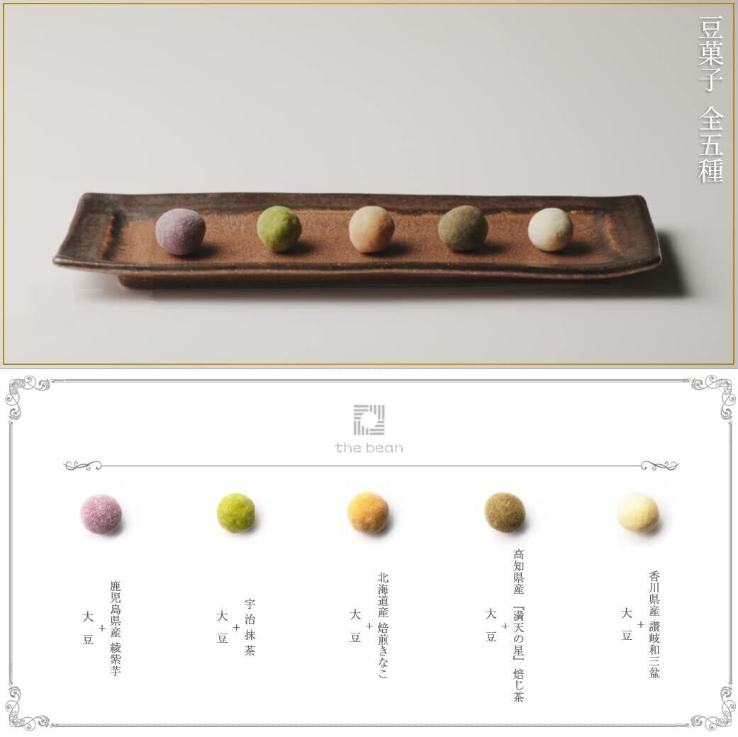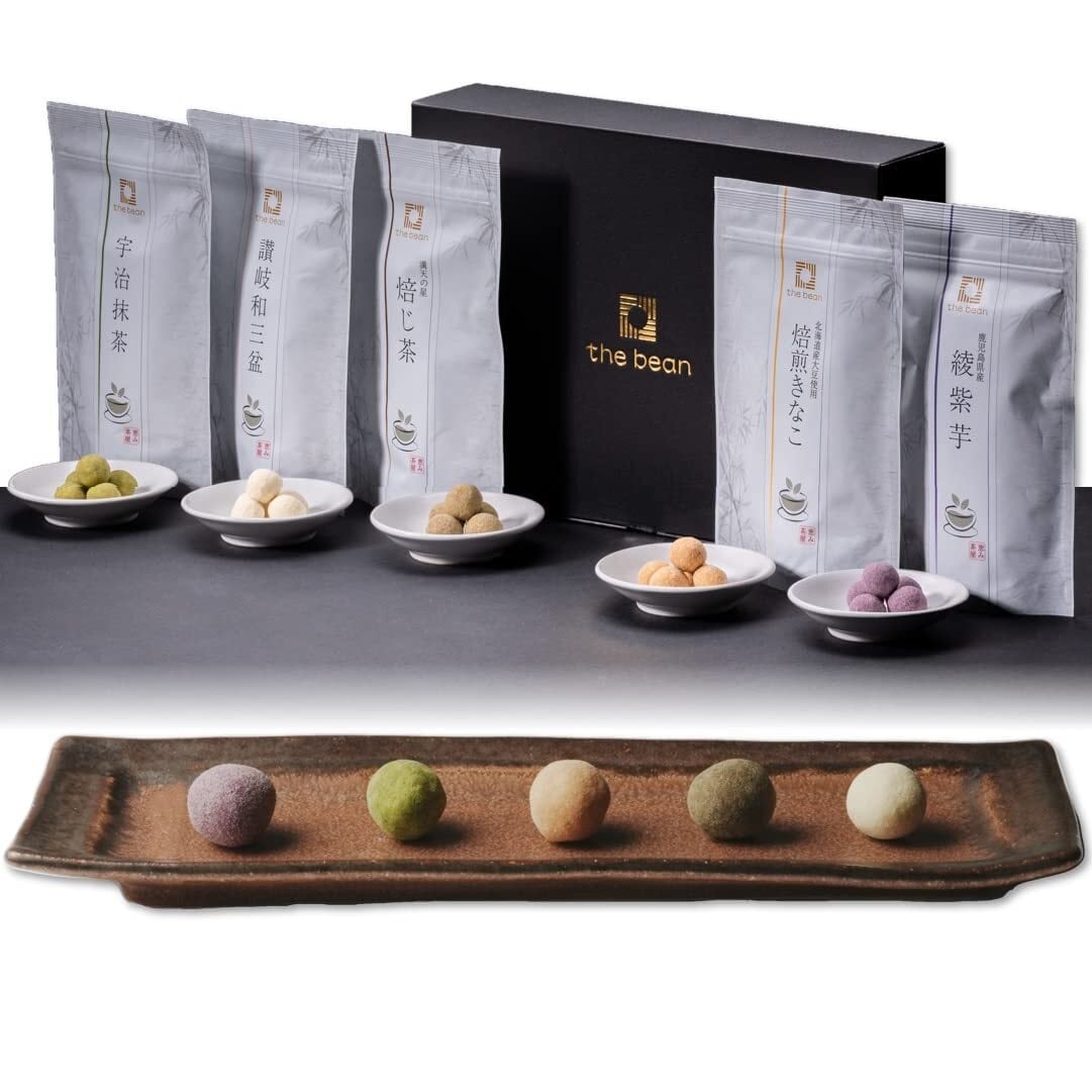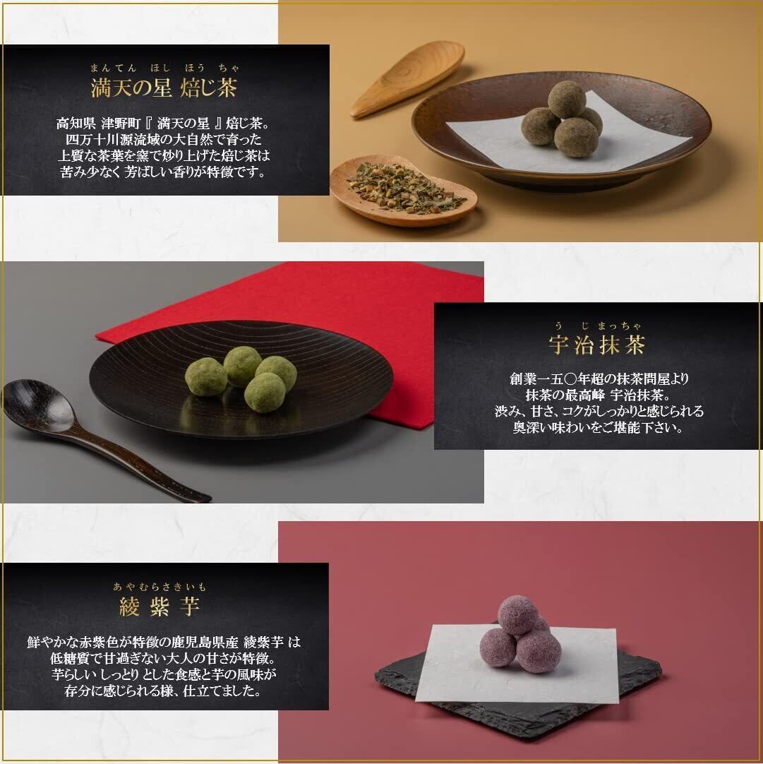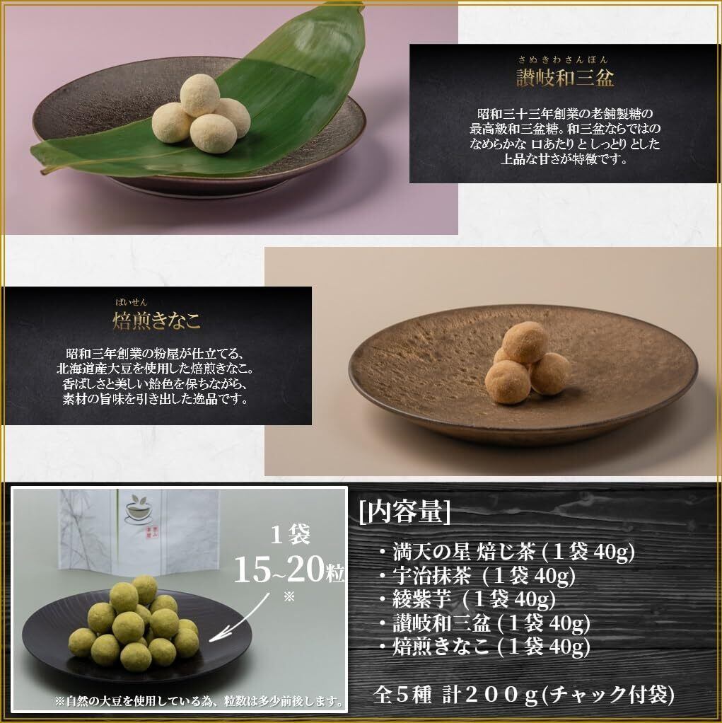 【特徴】『讃岐和三盆:昭和三十三年創業の老舗製糖の最高級和三盆糖。』、『焙じ茶:高知県 津野町 『 満天の星 』 焙じ茶。』、 『焙煎きなこ:昭和三年創業の粉屋が仕立てる、北海道産大豆を使用した焙煎きなこ。 』、『宇治抹茶:文久元年創業の抹茶問屋より抹茶の最高峰 宇治抹茶』、『綾紫芋:鮮やかな赤紫色が特徴の鹿児島県産 綾紫芋』の計5種。