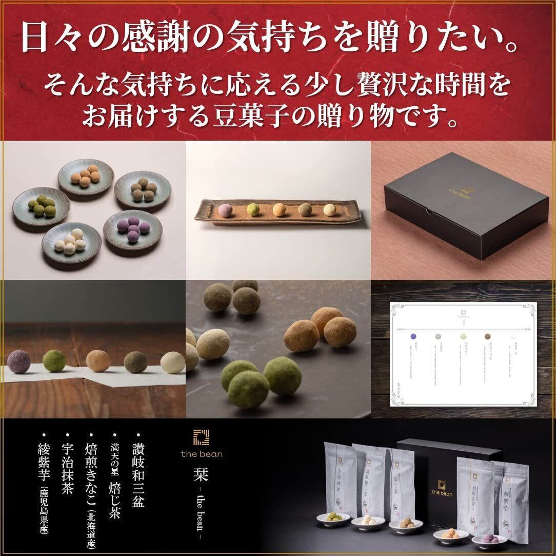 お歳暮 高級 豆菓子 ギフト 恵み茶屋 (-the_bean-/讃岐和三盆_焙じ茶_焙煎きなこ_宇治抹茶_綾紫芋_各40g 計200g)